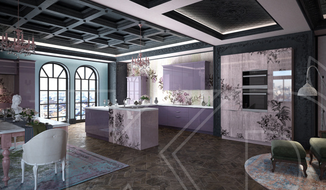Более темные, например, фиолетовые кухни с глянцевым покрытием подойдут для большой площади. Такие модели выглядят эффектно и необычно. При наличии дополнительной подсветки они смотрятся еще привлекательнее.