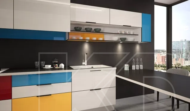 Реже встречается ДСП. Такая поверхность обрабатывается акрилом, а также пластиком. Наиболее дешевый выбор отделки фасадов — пленка ПВХ. В этой категории часто встречаются глянцевые серии. Они дают меньше блеска, чем эмаль или акрил. Если же в помещение попадет солнце, то вскоре цвет выгорит.