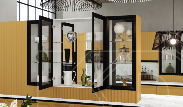 В просторных помещениях можно использовать сочетание черного с желтым. Такой дуэт выглядит очень смело и интересно. Конечно, темный оттенок в этом случае используется умеренно. Например, для оформления столешницы, цоколей, навесных полок.