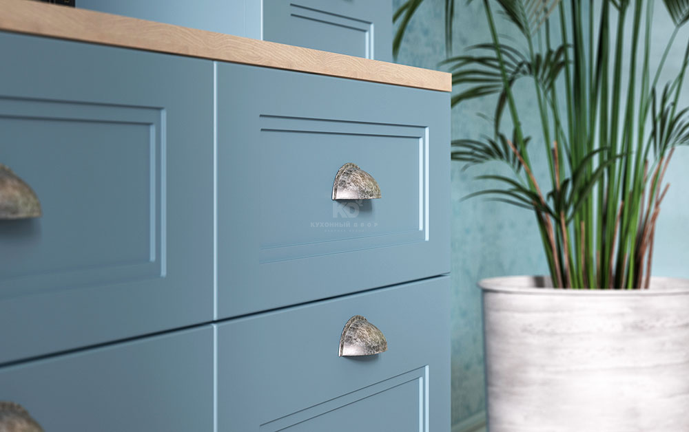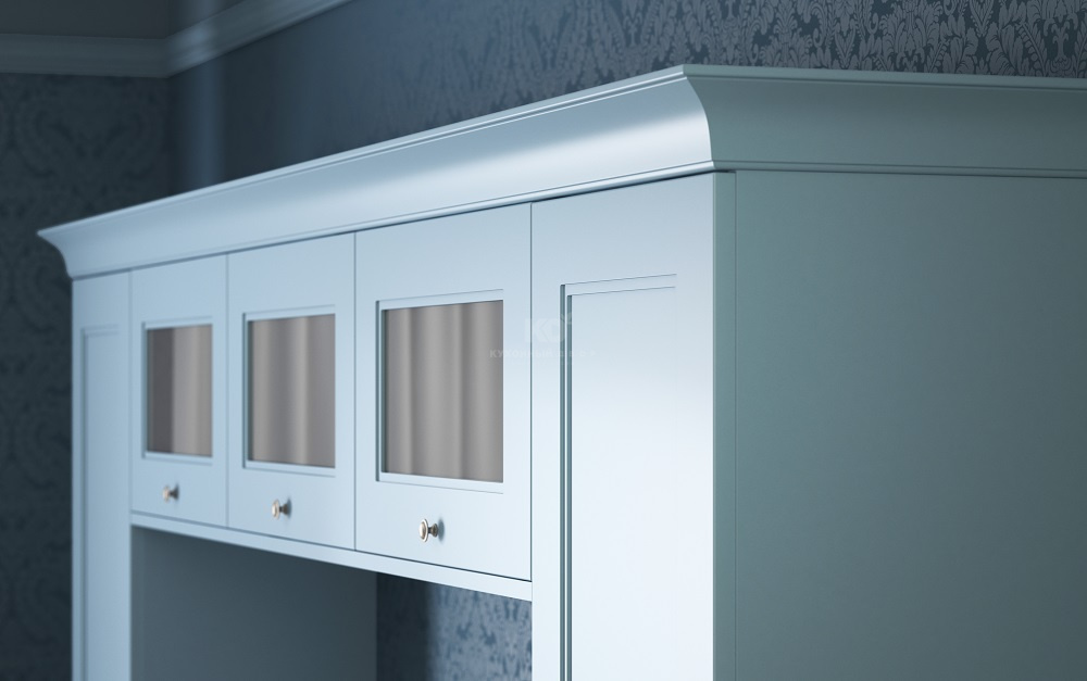 Как и полагается настоящей леди, в гардеробе «Эрики» не только голубой, но и великое множество других цветов. А ещё немало элегантных дизайнерских «украшений». Так фасады модели имеют строгую классическую фрезеровку и могут быть оснащены модными ручками-полусферами под состаренное серебро. А изящные карнизы и матированные витражи не дадут забыть о классическом характере Вашей «Эрики».