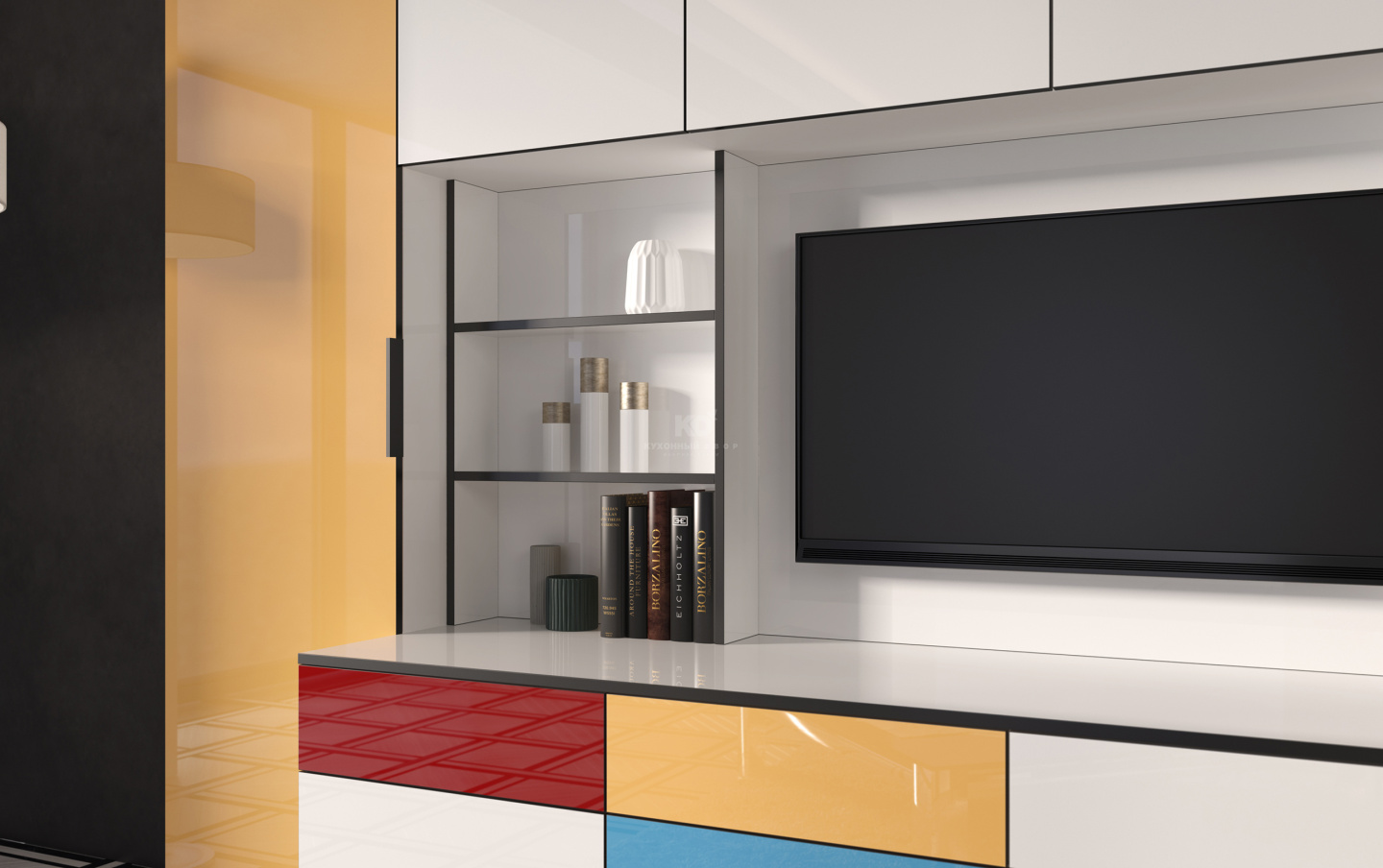 Концепция «Мондрианы» проста и, в то же время, наполнена творческими смыслами. Белые фасады здесь – созидательное женское начало. Чёрные кромки – мужская забота, направляющая и оберегающая. Жёлтые, красные и синие акценты – эмоции, рожденные от взаимодействия двух полярных оттенков. Ведь все цвета – это лишь определенные состояния между чёрным и белым!