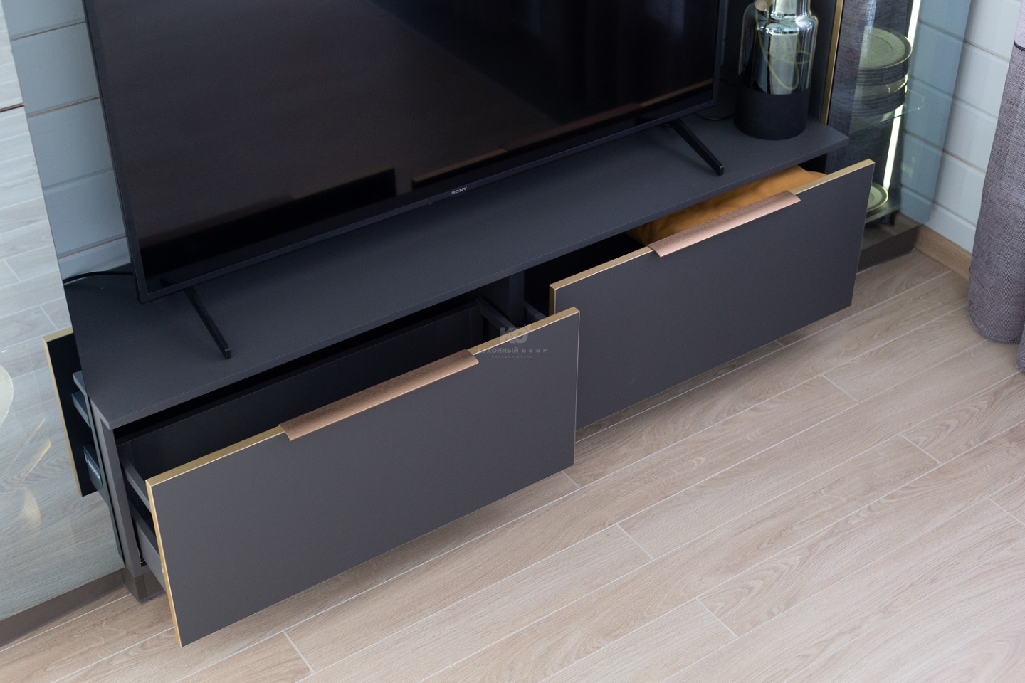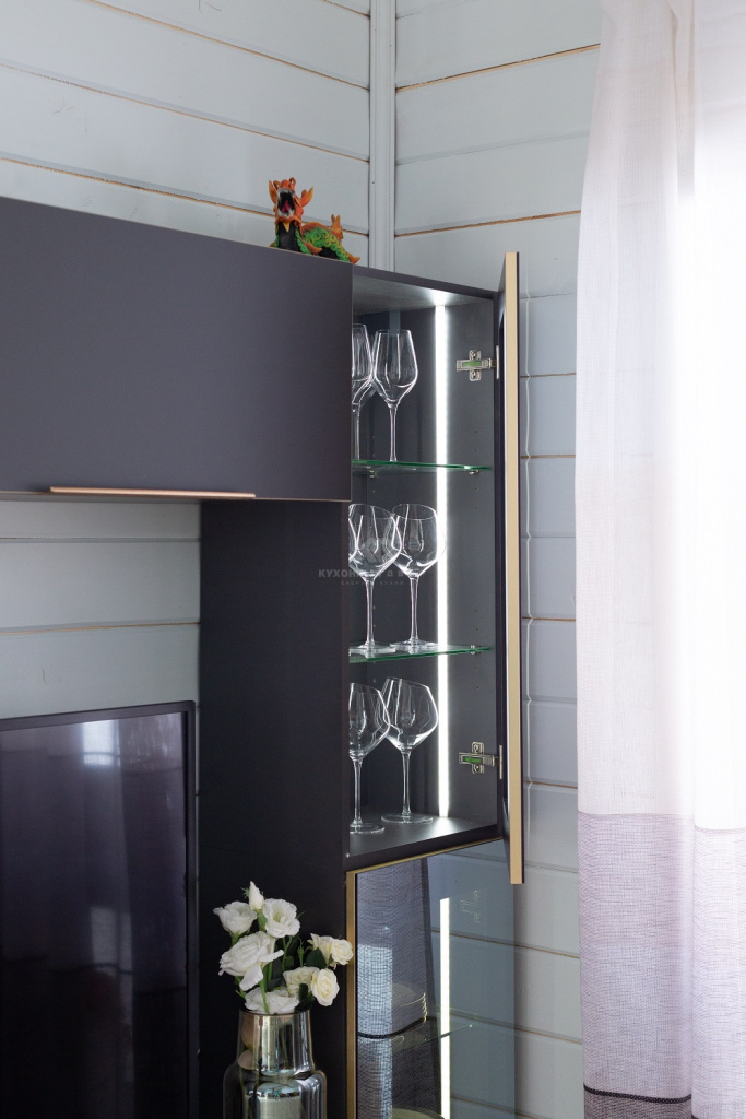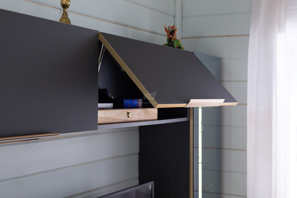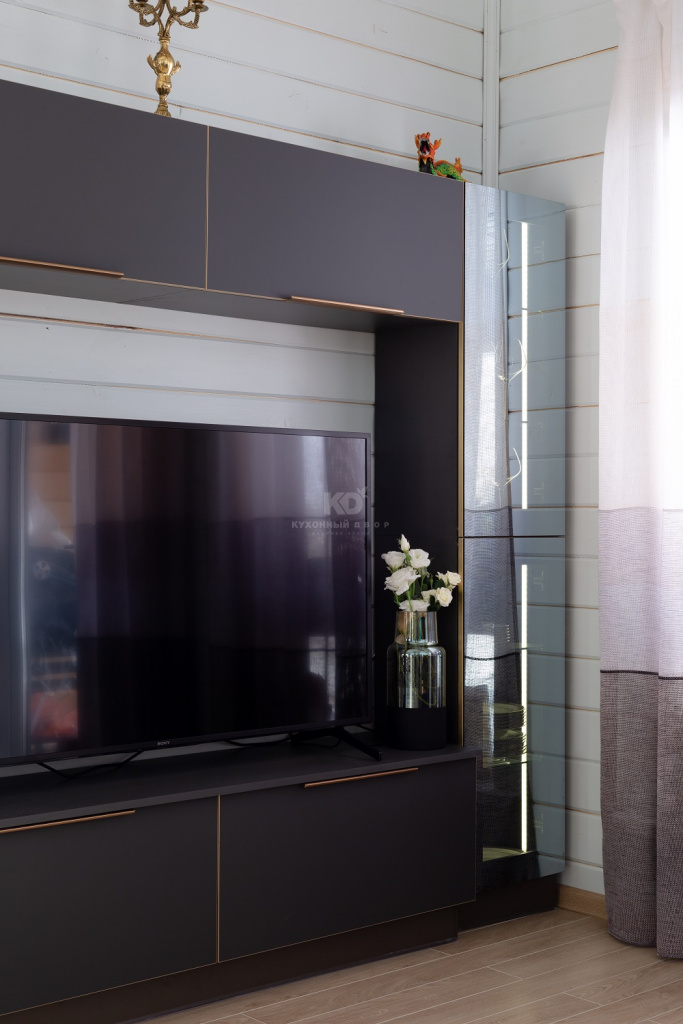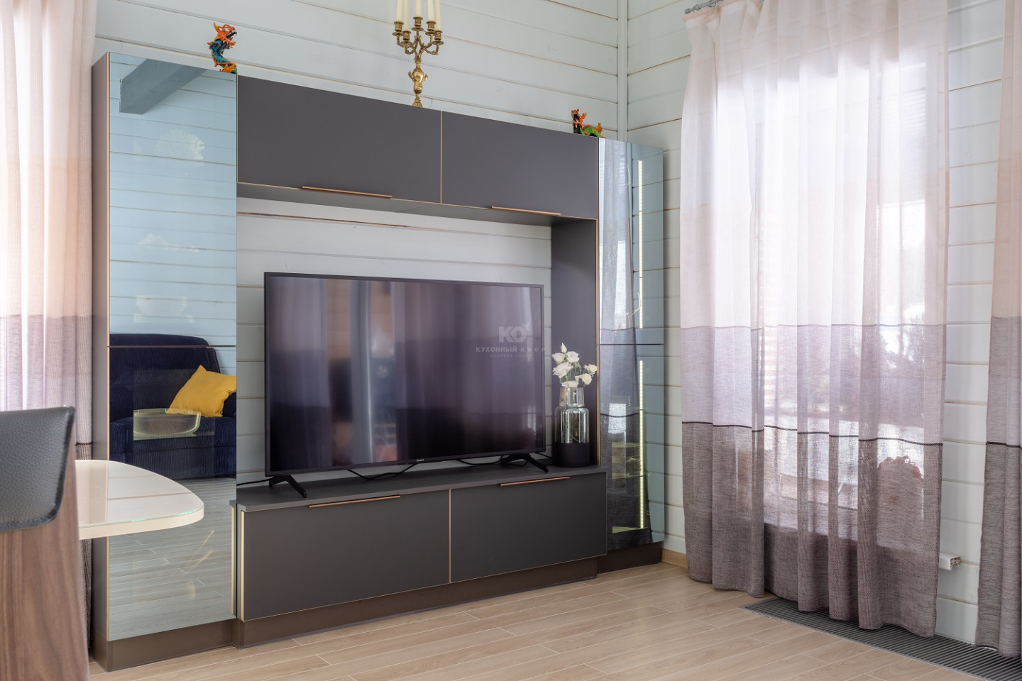 Стремясь сохранить лёгкость и ощущение простора в доме, наши дизайнеры создали TV-зону, стильную снаружи и функциональную внутри! Зона имеет два типа фасадов: «бархатистые» с покрытием «Extra Touch Matt» и почти «зеркальные», с высокой степенью светоотражения. Благодаря такому сочетанию гостиная выглядит «дорого» и презентабельно, сохраняя при этом лёгкость и лаконичность! А чтобы подчеркнуть её люксовый облик, торцевые части фасадов имеют стильные металлизированные акценты.
