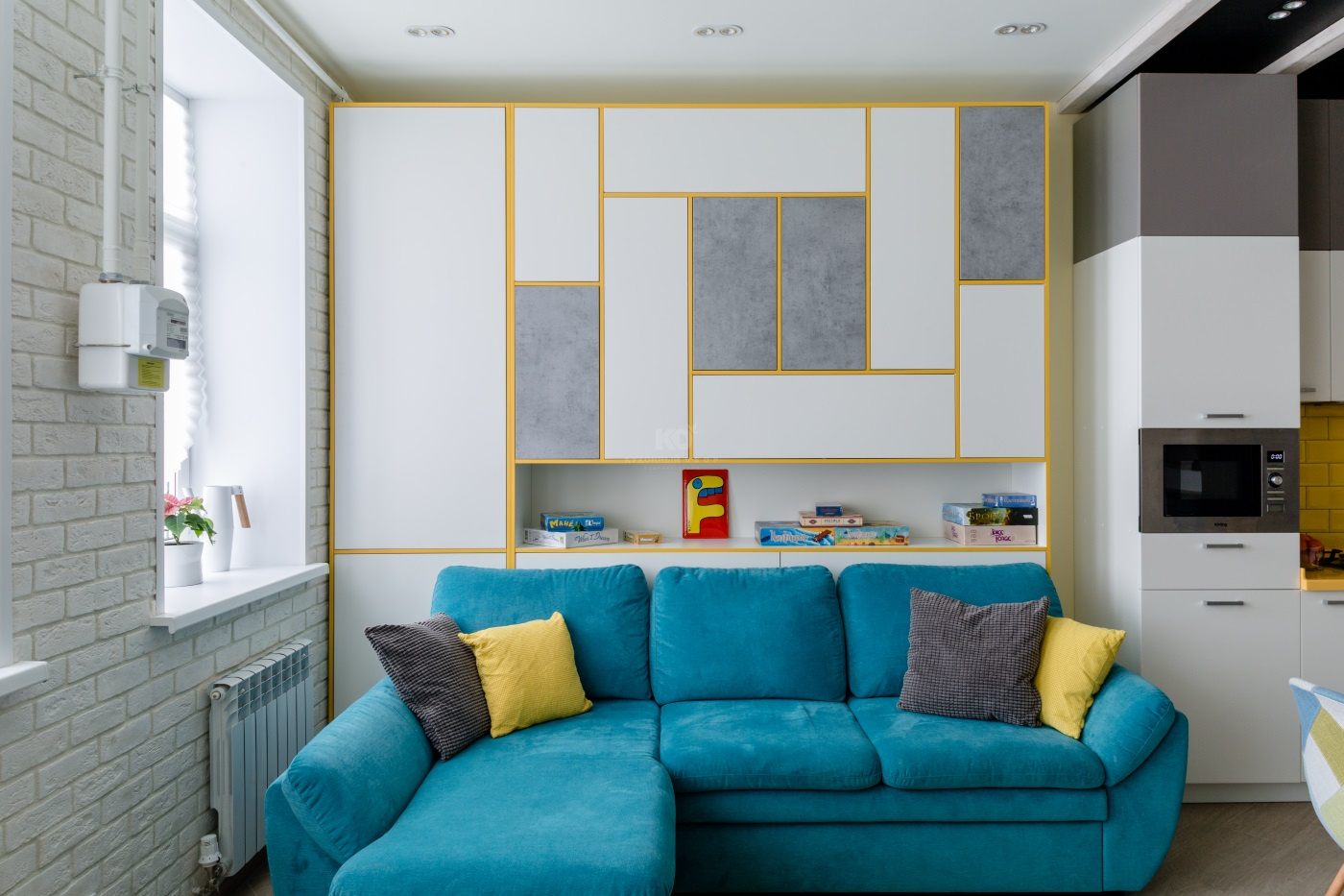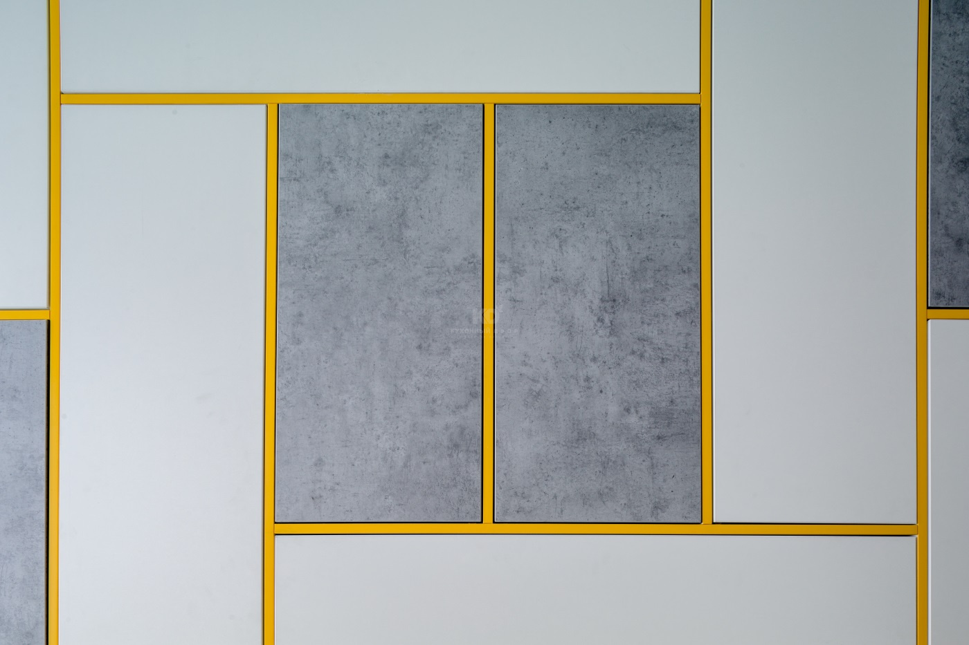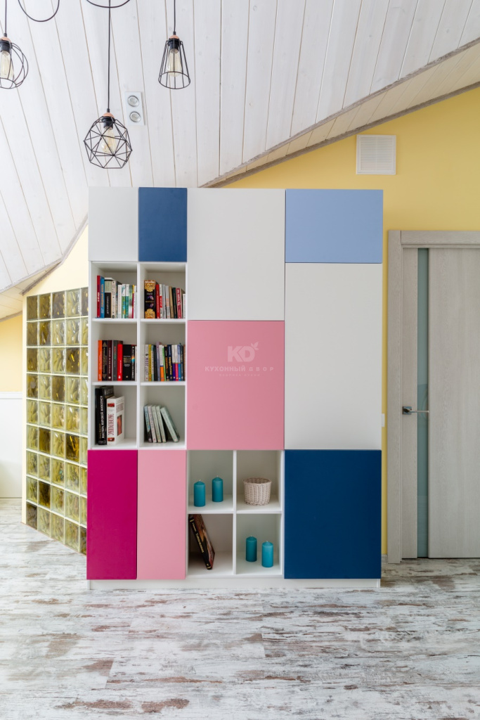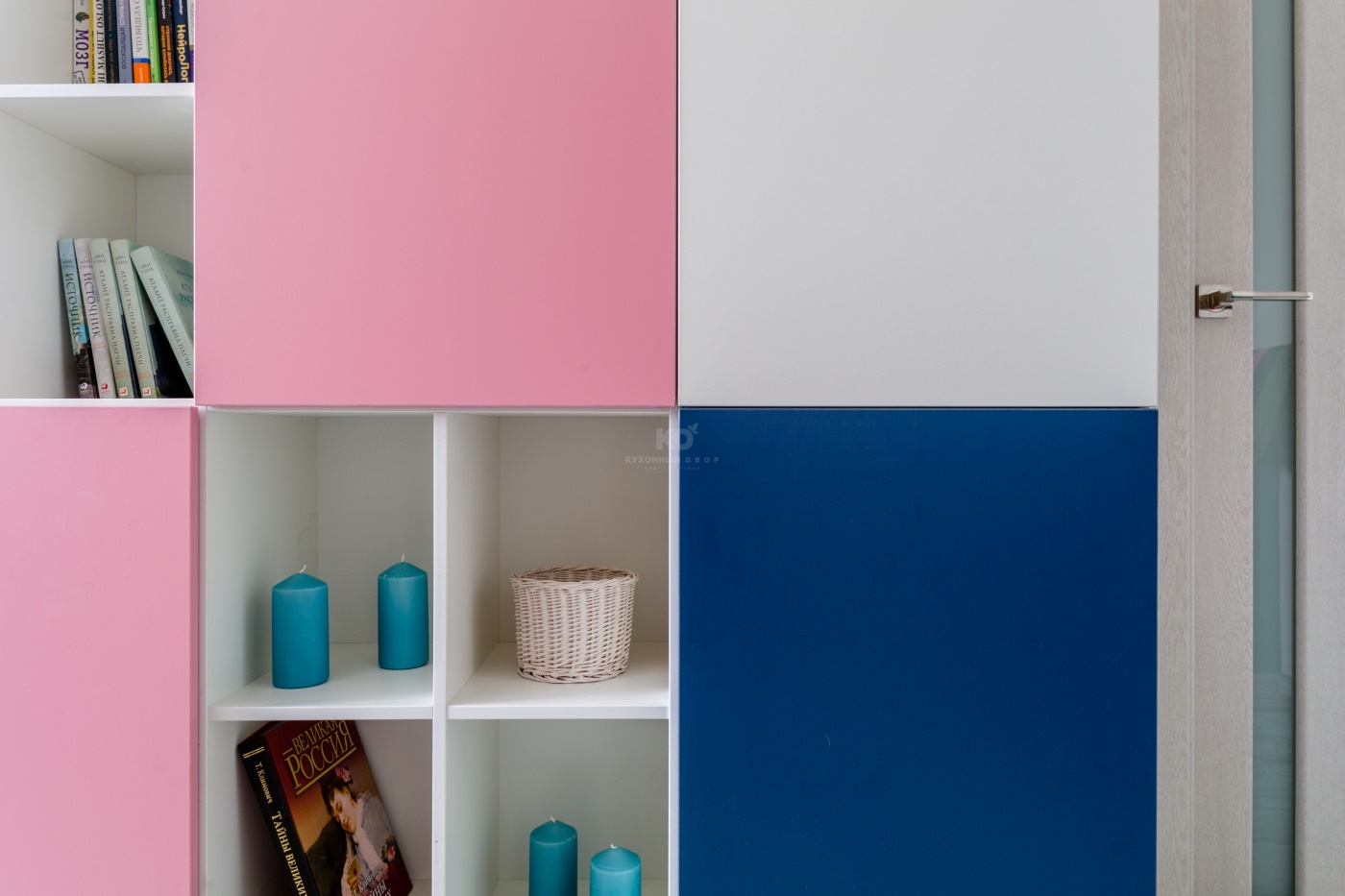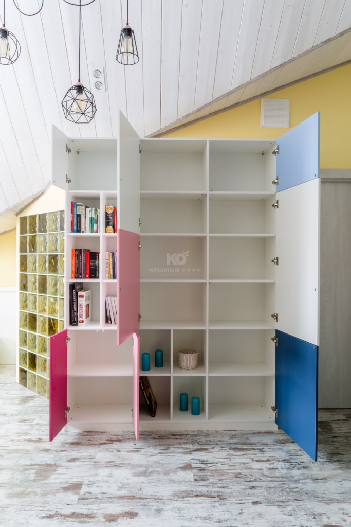 Дизайн «стенки» основан на игре белого, серого и жёлтого цветов. В результате мебель гармонично смотрится в одном пространстве с кухней. При этом она не лишена индивидуальных черт, которые проявляются в фактуре серых участков «под бетон» и в отсутствии ручек на дверцах. Нет ручек и у библиотеки. Зато она полна новых красок! С белыми и открытыми участками прекрасно «соседствуют» розовые, сиреневые, голубые и синие модули из MDF. Строгие пропорции и яркий дизайн дают замечательный контраст!