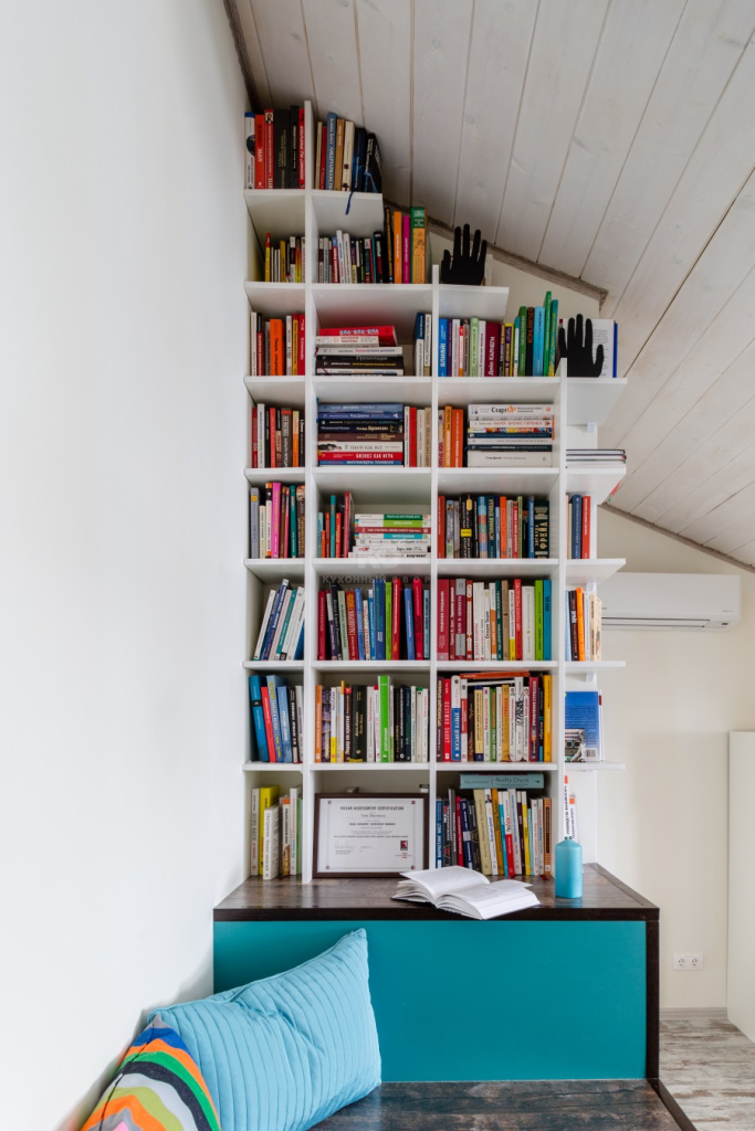 Книжные полки в читальной зоне – единственная мебель, которую хозяйка решила сделать полностью открытой. Сверху полки расположены «лесенкой» и повторяют уклон потолка. Остальные пять ярусов полностью симметричны. Белый цвет создает иллюзию того, что шкаф является продолжением стены. В итоге вся композиция смотрится лаконично и современно.