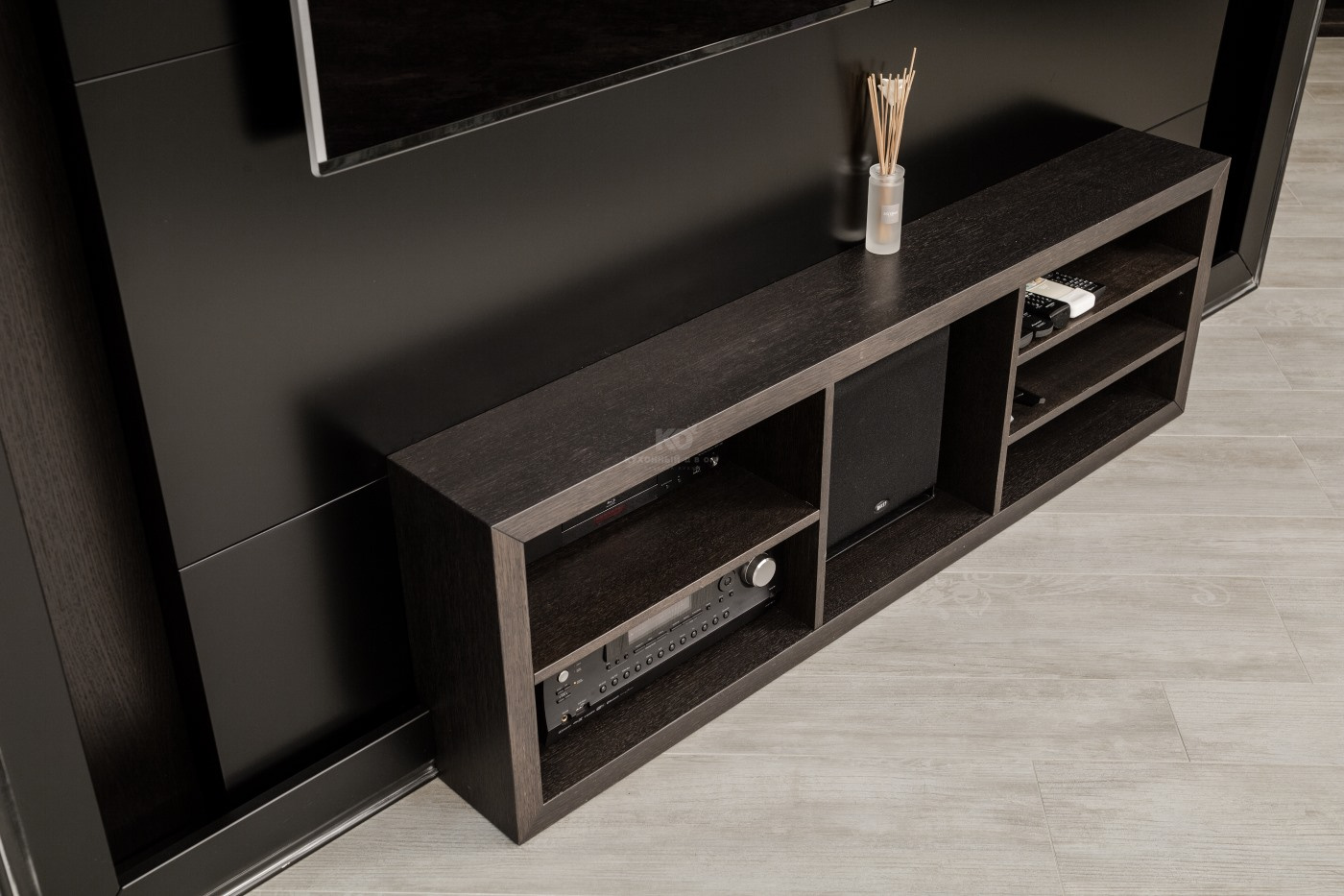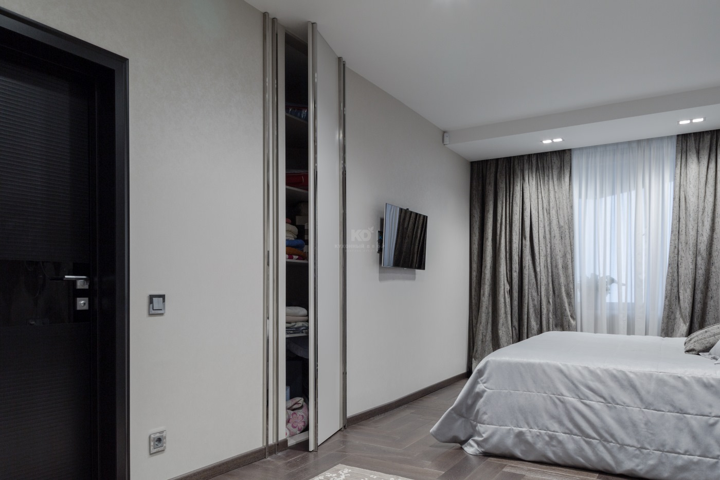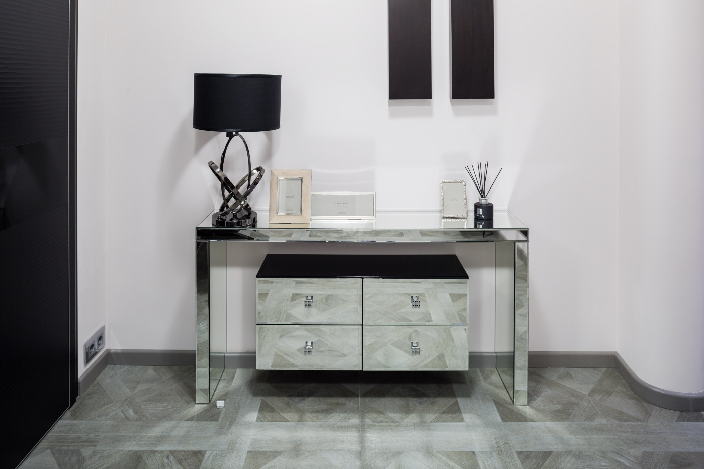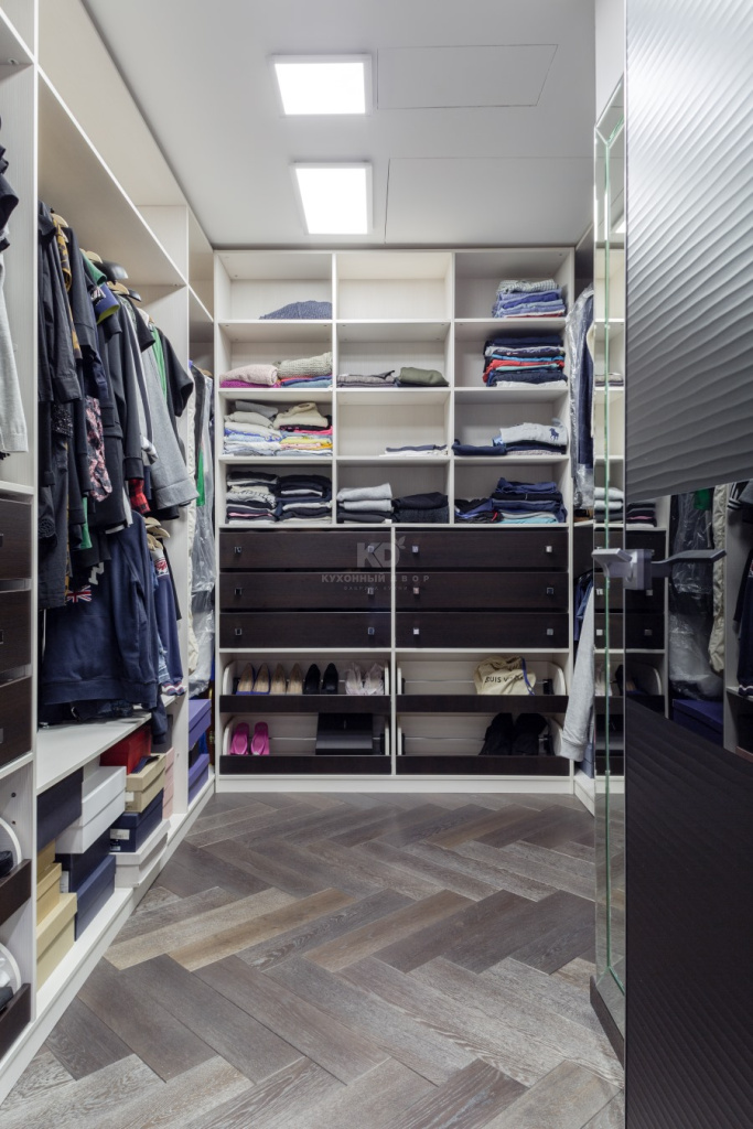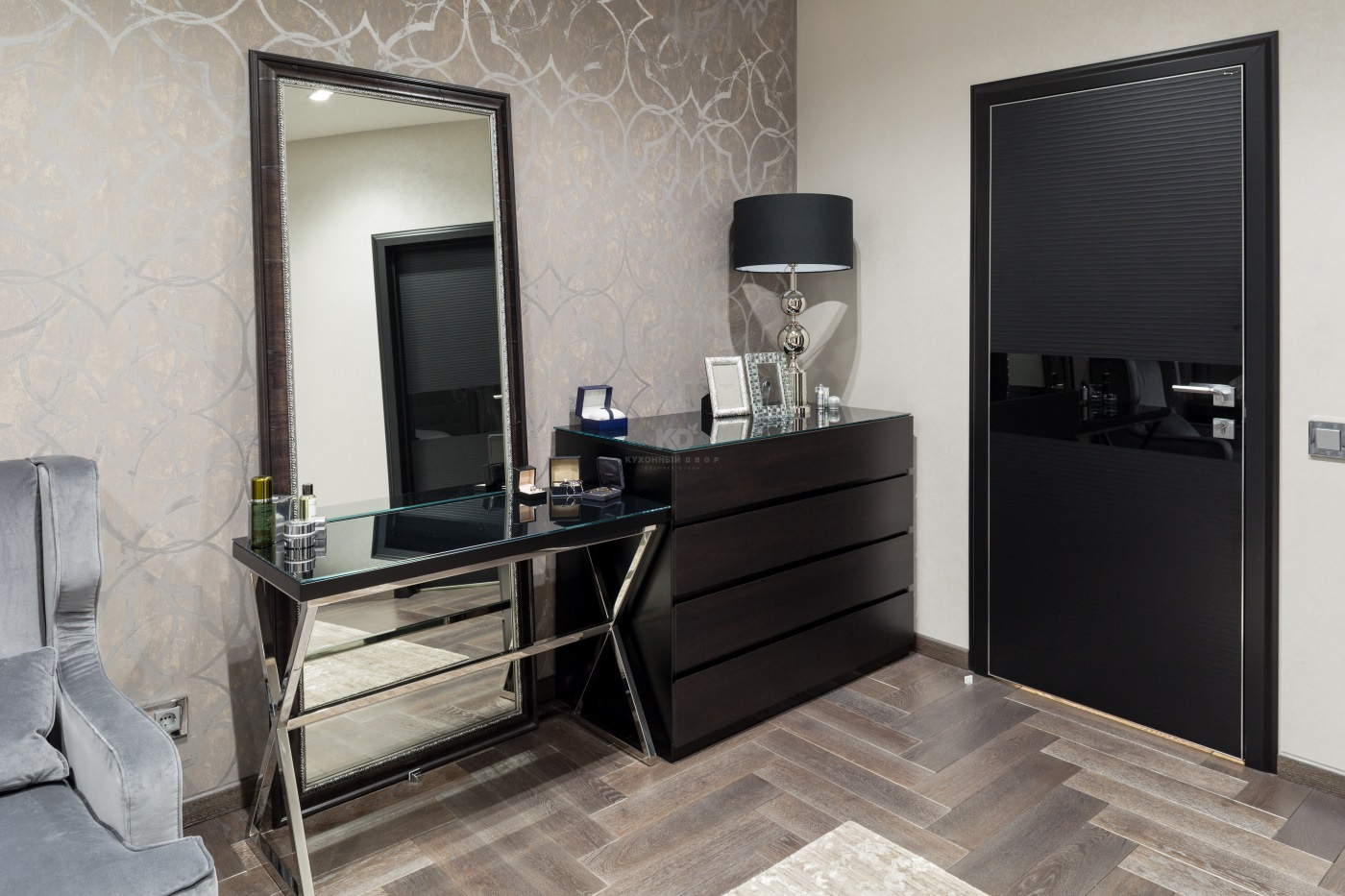 Прихожая выдержана в стиле минимализм с элементами английской классики: игра цветовых контрастов сразу задает настроение при входе в квартиру. Она продолжена в комнате, о которой мечтает каждая женщина – в просторной гардеробной. В светлых ящичках поместилось все, и даже больше, как и в открытых темных нишах. Дальше – больше: спроектировали и создали встроенный шкаф с высокими белоснежными дверцами и металлической вставкой, ТВ-портал, эксклюзивные элементы спален – например, будуарный столик с зеркальными вставками. Каждый элемент мебели продуман до мелочей, а исполнение его можно считать вершиной мастерства производителя.