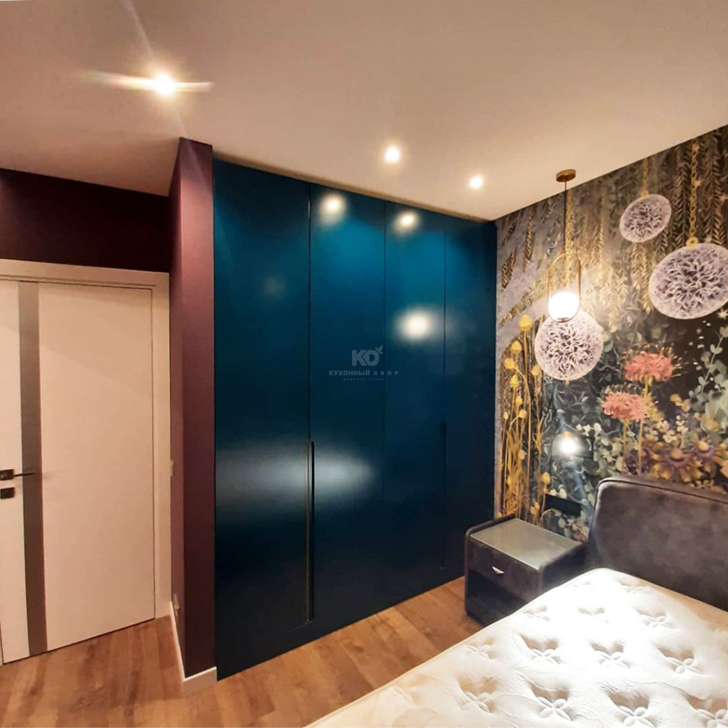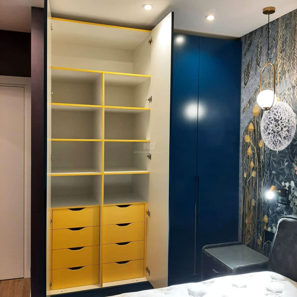 - Высокий мультисекционный шкаф в спальне имеют схожие интегрированные ручки, однако фасады здесь покрыты уже матовой эмалью. Глубокий синий цвет лакокрасочного покрытия наполняет интерьер спокойствием и умиротворением. Но стоит только открыть фасады, и эмоции меняются на солнечно-радостные! Внутри шкаф выполнен в жёлто-белой палитре: яркие акценты расставлены на внутренних выдвижных ящиках и на торцевых частях глубоких открытых полок. Выглядит сочно, стильно и свежо!