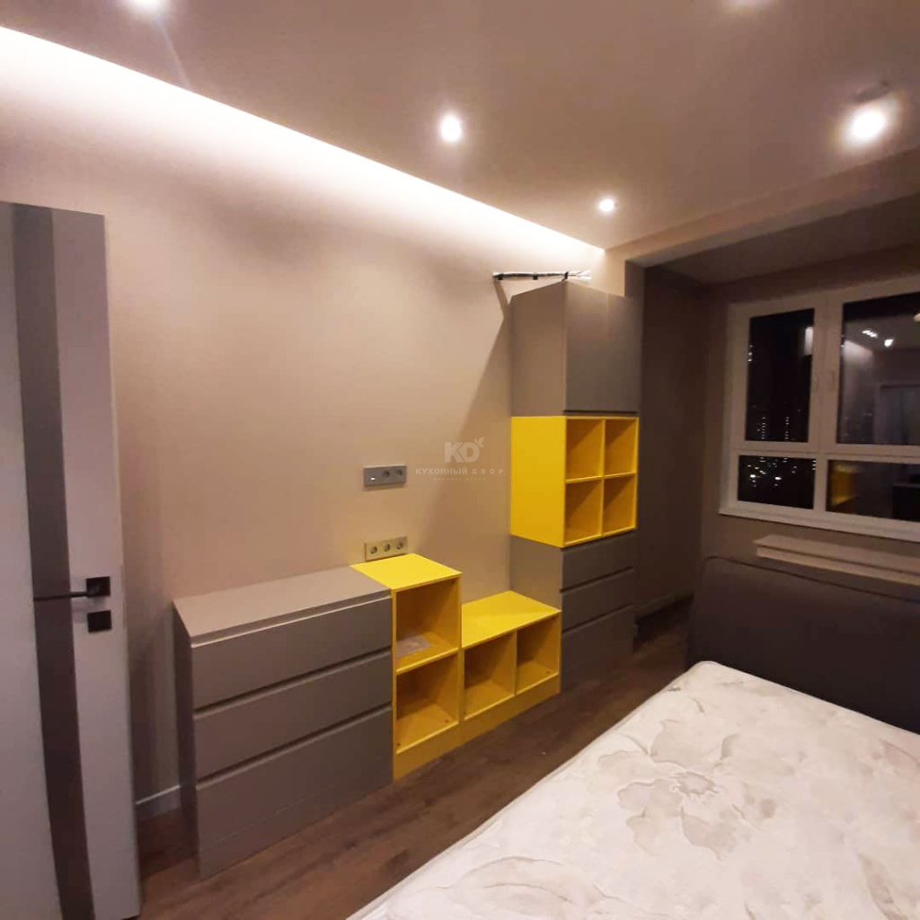 - И финальной работой в рамках этого проекта стал комплект мебели в комнату для подростка, выдержанный в трендовом минималистичном стиле. Обилие открытых зон и выдвижных ящиков позволяет хранить здесь всё, что пожелает душа. По сути это стильный микс высокого шкафа, стеллажа и ТВ-зоны. И этому миксу очень идёт сочетание жёлтого и серо-кашемирового цветов!