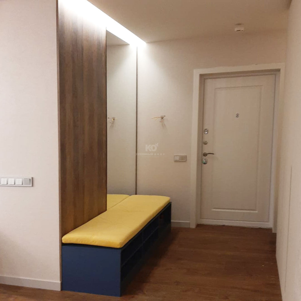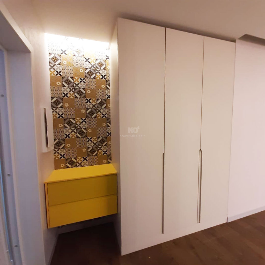 - Мебель в прихожей также поднимает настроение сочной палитрой, однако здесь дизайнеры добавили ещё и фасад с древесной текстурой. Получилось очень «по-шведски»: высокий уровень комфорта, впечатляющая вместимость и нотка природной красоты. Есть в прихожей и высокий трёхсекционный гардероб в цвете «серый кашемир». Этот оттенок выглядит «лёгким» и, вместе с тем, благородным. Фасады гардероба выполнены из МДФ с «дышащим» покрытием-экомембраной.