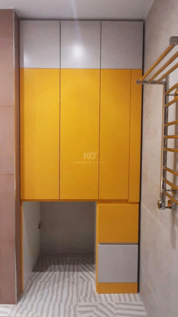 - Шкаф в ванной комнате обладает впечатляющей высотой и глубиной. Выполненный под потолок, он способен вместить мелкие банные принадлежности, халаты, косметику, полотенца и другие необходимые предметы обихода. Места для вещей хватит на целую семью! А стильная жёлто-белая палитра фасадов из МДФ с покрытием «матовая эмаль» не даст заскучать никому.