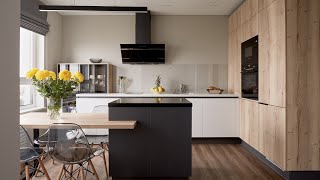 Стоит пройти в дом поглубже, и прихожая открывает свой главный секрет: деревянный куб, встретивший нас с порога, является ещё и неотъемлемой частью кухни. Подробнее о ней читайте здесь. И обязательно посмотрите отзыв по проекту от счастливой хозяйки!