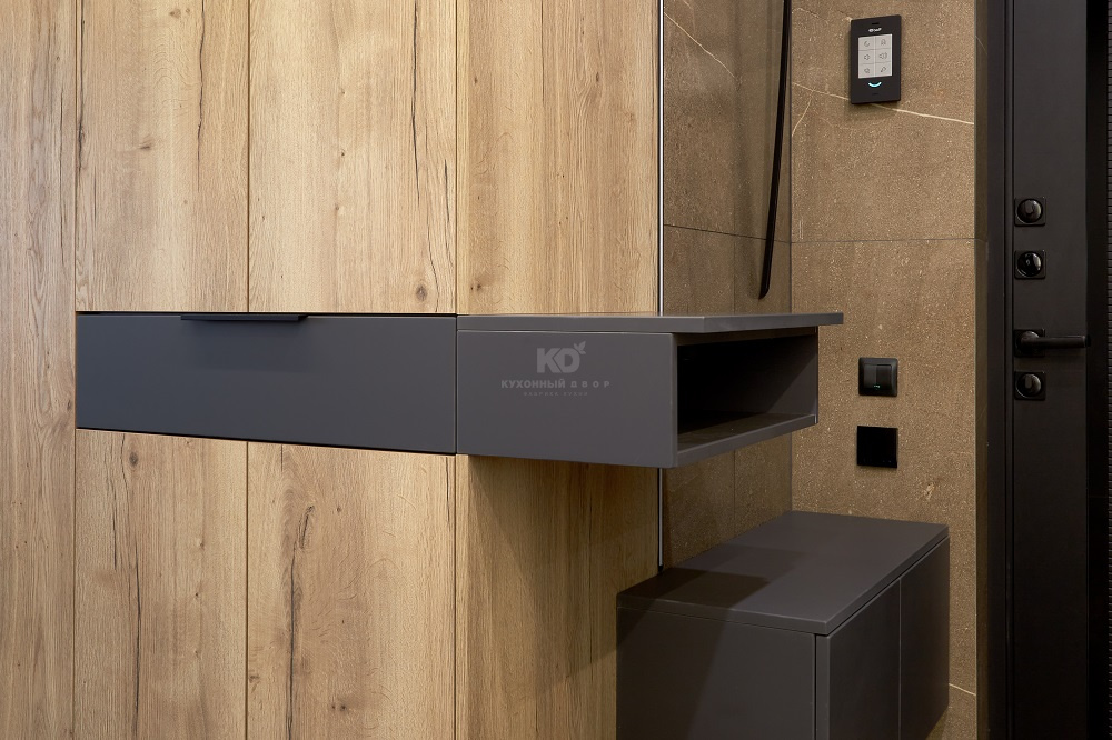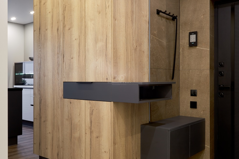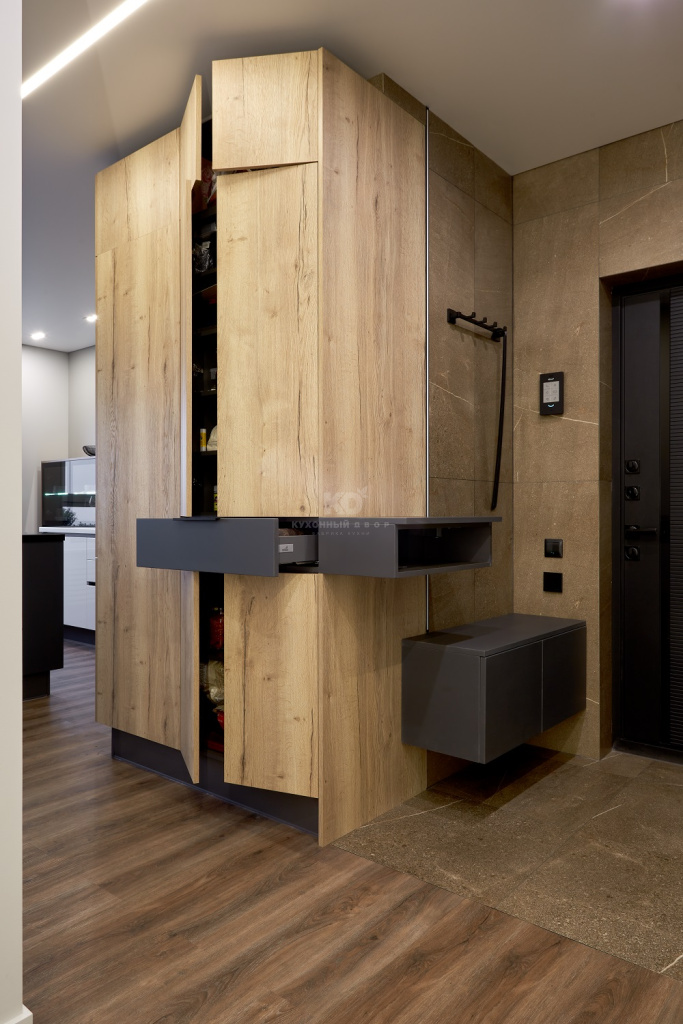 Знаете, как с порога узнать по-настоящему модное жилище? Взглянуть на прихожую! Если она интригует с первого взгляда, остальные интерьеры, скорее всего, тоже будут хороши. Здесь всё получилось именно так. Перед вами входная мебельная группа, которая не только поражает красотой натуральных фактур, но и является…частью кухни!