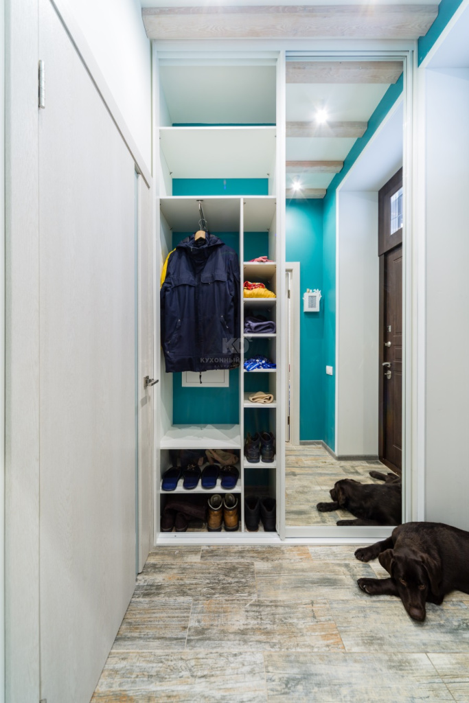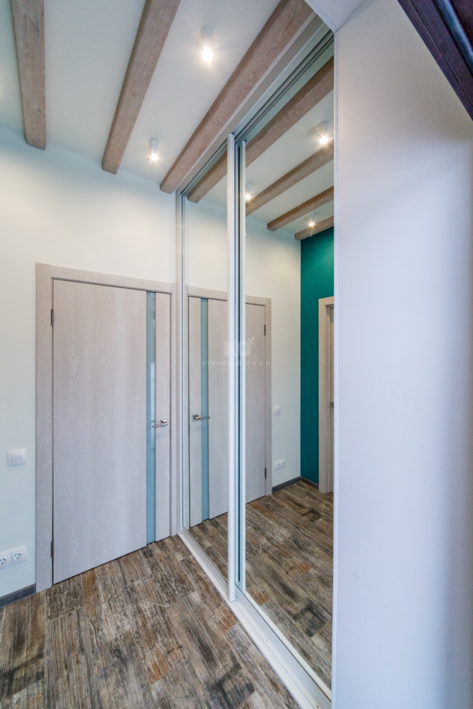 При оформлении прихожей вместо акцента на контрасты требовалось визуально расширить пространство. Поэтому мы создали шкаф-купе с полностью зеркальными дверями. Это один из самых эффективных способов сделать небольшое помещение просторнее.