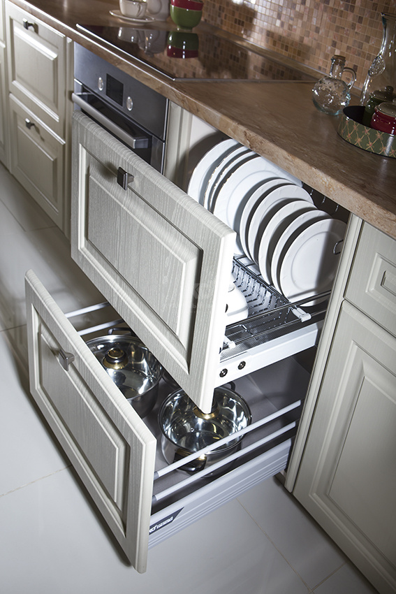 С функциональной точки зрения «Катарина» универсальна и технически совершенна. Современная фурнитура, вместительные ящики, широкие ниши позволят любой хозяйке не экономить на пространстве, а с легкостью разместить все, и даже больше.