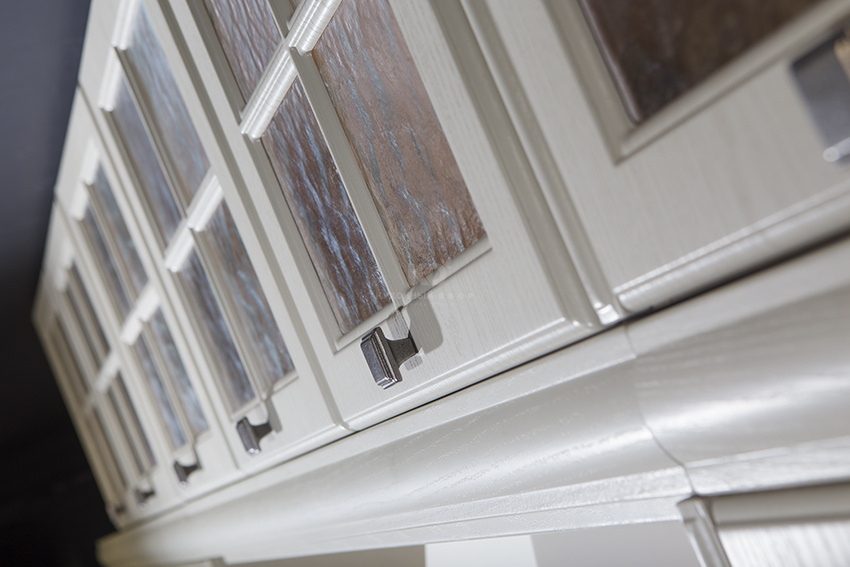 Также в модели представлен долгожданный витраж с декоративной раскладкой. Новый тип глухого фасада уникален в своем исполнении: прямоугольная фрезеровка и калевка "Katarina" с раскладкой имитирует филенку классического фасада. Важный элемент интерьера — кухонная вытяжка, бандаж которой, по желанию клиента, может быть максимально подобран под цвет фасада.
