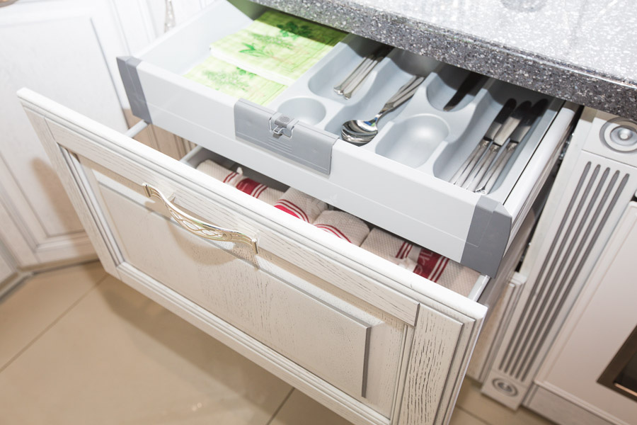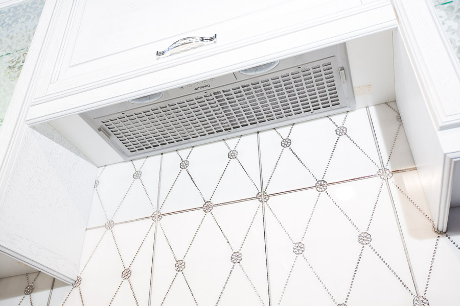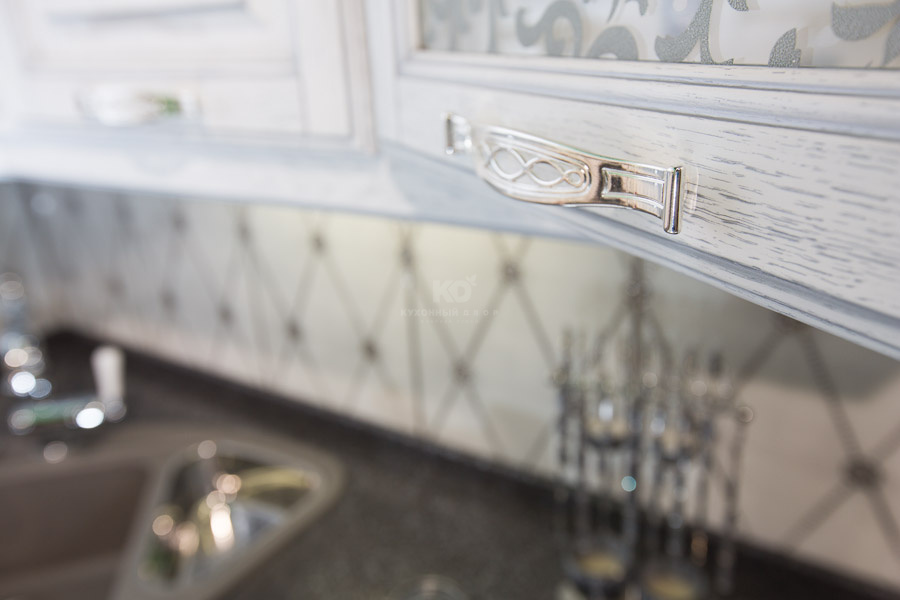 Кухни белые, серебром отделанные, выглядят элегантно и роскошно. В сочетании с бежевыми, болотными или оливковыми элементами интерьера такой гарнитур превратит любую кухню не только в комфортное место для приема пищи, но и в уютную зону отдыха с гостеприимной атмосферой.