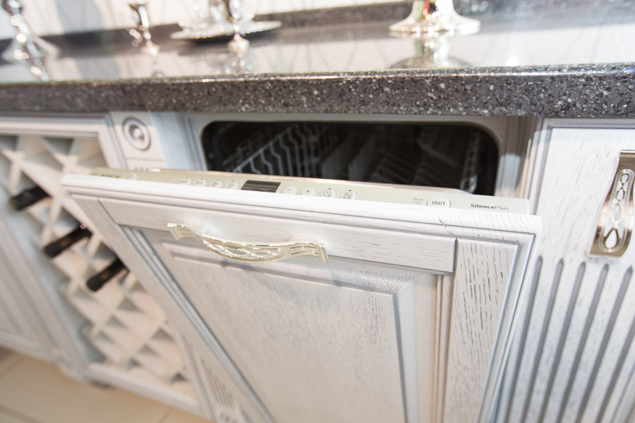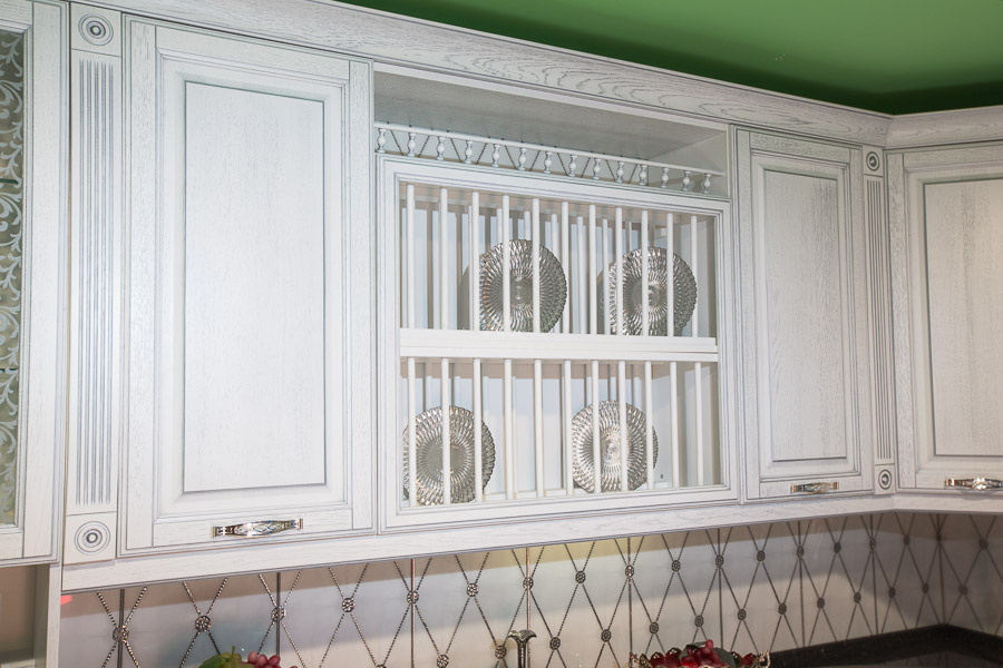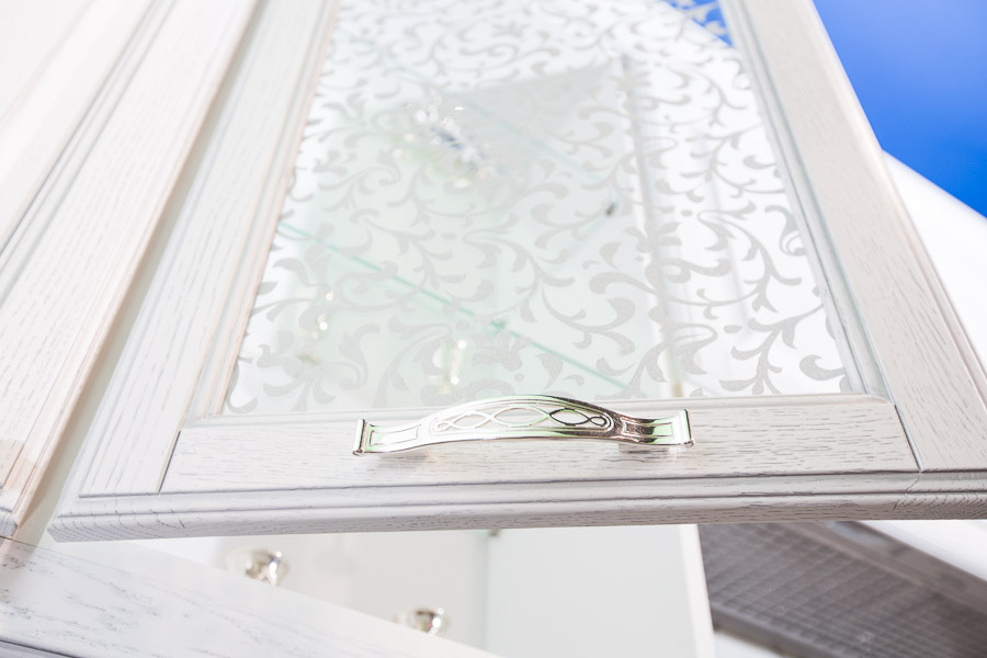 Внешний вид современной классики тоже имеет ряд специфических особенностей. «Виконт», как лучший образец перевоплощения, не перегружен деталями. Декор модели скорее сдержанный, чем кричащий. Стилевые акценты, подтверждающие классическое происхождение гарнитура, расставлены очень интеллигентно. Традиционные для классики филенчатые фасады, покрытые серебряной патиной, гармонично сочетаются с резными пилястрами, а декоративные решетки на нижних фасадах образуют слаженный дуэт с открытой сушкой для посуды. Прекрасно смотрится ниша над сушкой, обрамленная балюстрадой. Обращает на себя внимание винотека для удобного размещения бутылок вина. Еще один эксклюзивный элемент гарнитура — настольный буфет с открытой нишей. Красоту стекла с матовым рисунком, нанесенным по технологии «Кристалайзер», подчеркивает нежный свет встроенных за нижний карниз светильник. Белый цвет гарнитура собирает все стилевые детали в единую картину торжественного величия.
