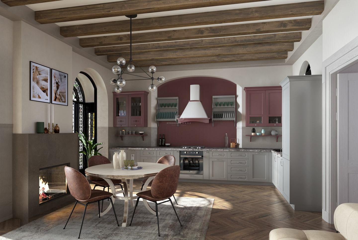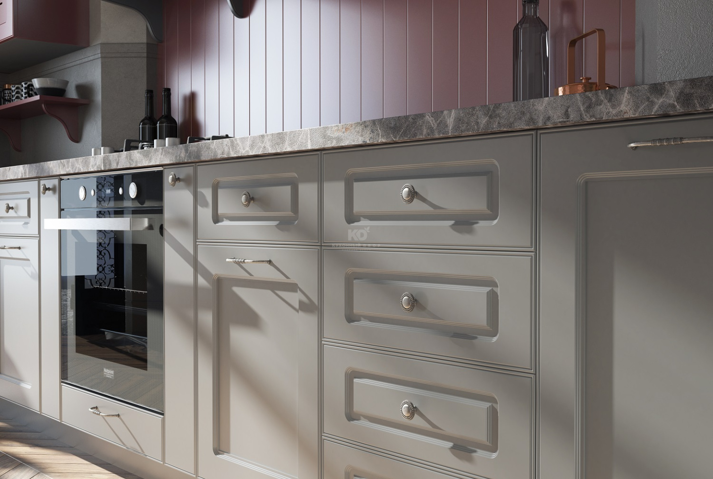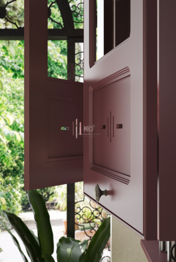 «Свобода!» – вот первое слово, которое приходит на ум, когда оказываешься рядом с такой кухней. Неповторимое ощущение простора роднит «Адриану Вереск» с кухнями в скандинавском стиле. При этом модель, конечно же, относится к классике. Об этом говорит скруглённая по углам фрезеровка фасадов из МДФ, массивная вытяжка, элегантные ручки «серебро Антик», комбинация глухих и застеклённых зон в фасадах верхнего яруса, наличие изящных карнизов, открытые элементы со сложными скруглёнными торцами. Также здесь присутствует точечная сквозная декоративная фрезеровка. Это «фирменная» черта «Адрианы», которая делает интерьеры особенно очаровательными.