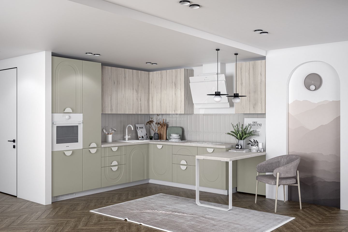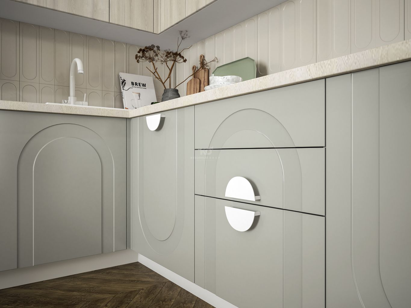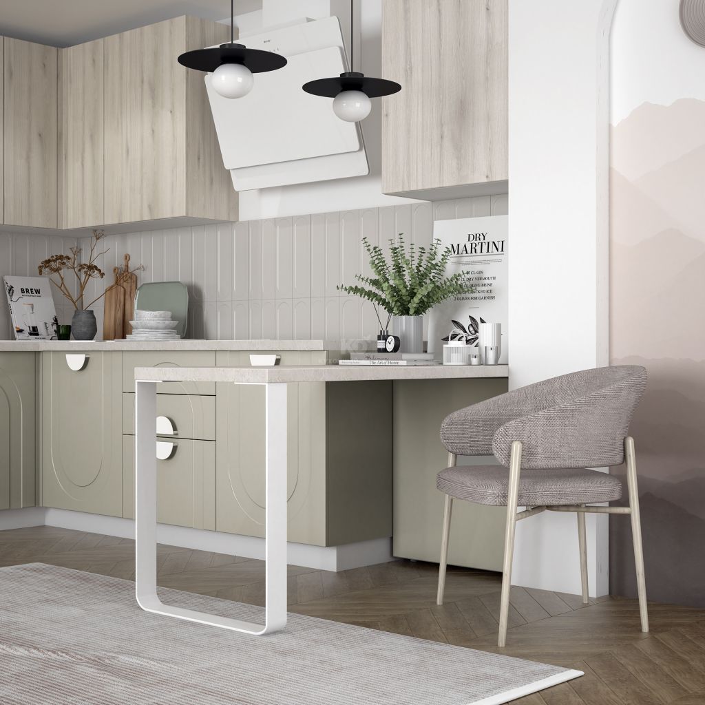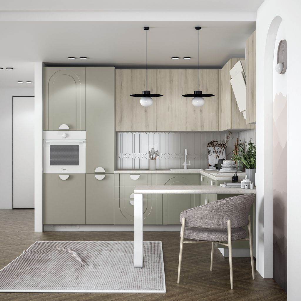У этой фрезеровки есть свой язык вариаций. Арки можно направить вверх — для торжественного, динамичного ритма, или вниз, добавляя мягкость и камерность. Сочетание с гладкими фасадами позволяет играть с пропорциями, выделять отдельные зоны, создавать симметрию или легкую творческую асимметрию. Эта вариативность делает кухню гибкой — все зависит от того, какую тональность вы хотите задать ей и всему интерьеру.