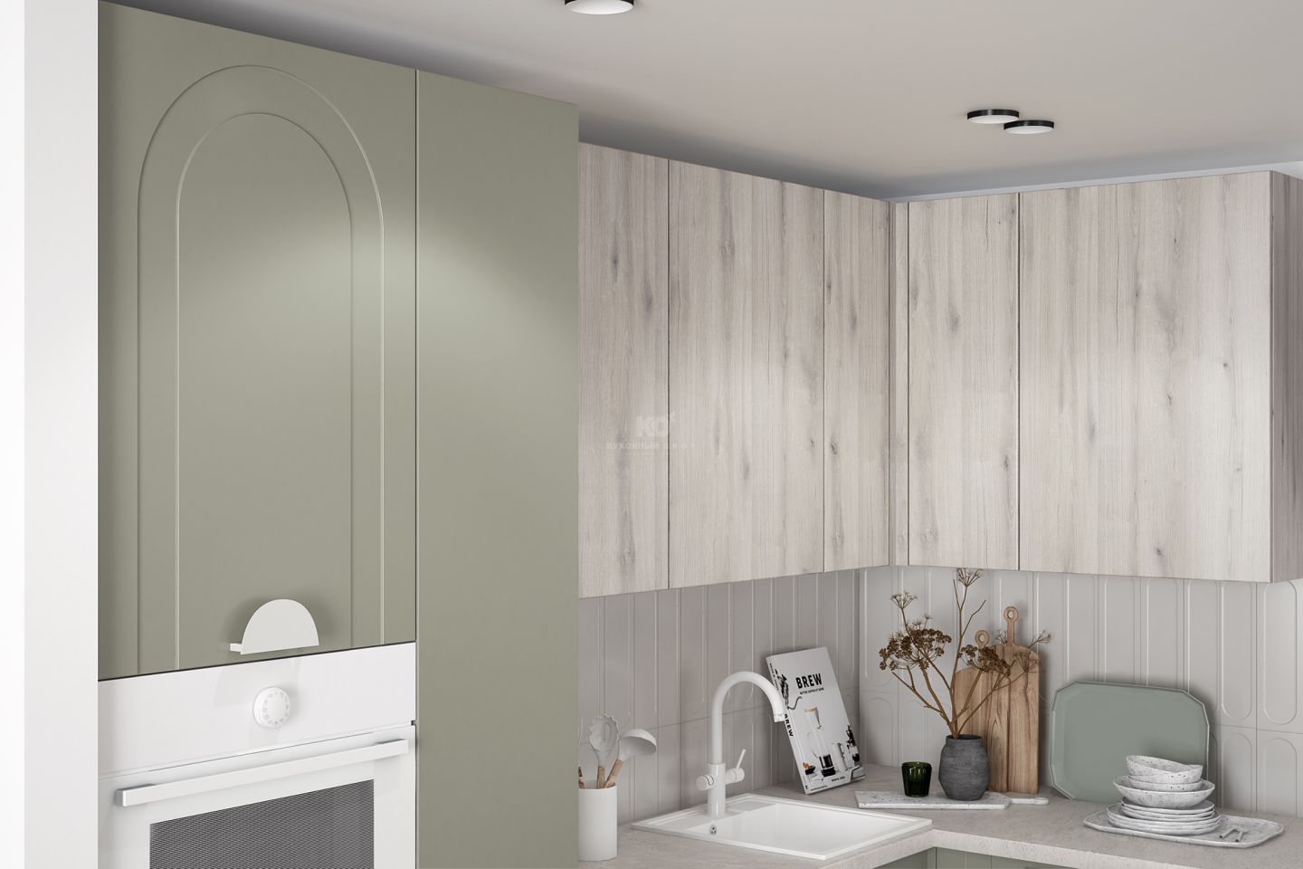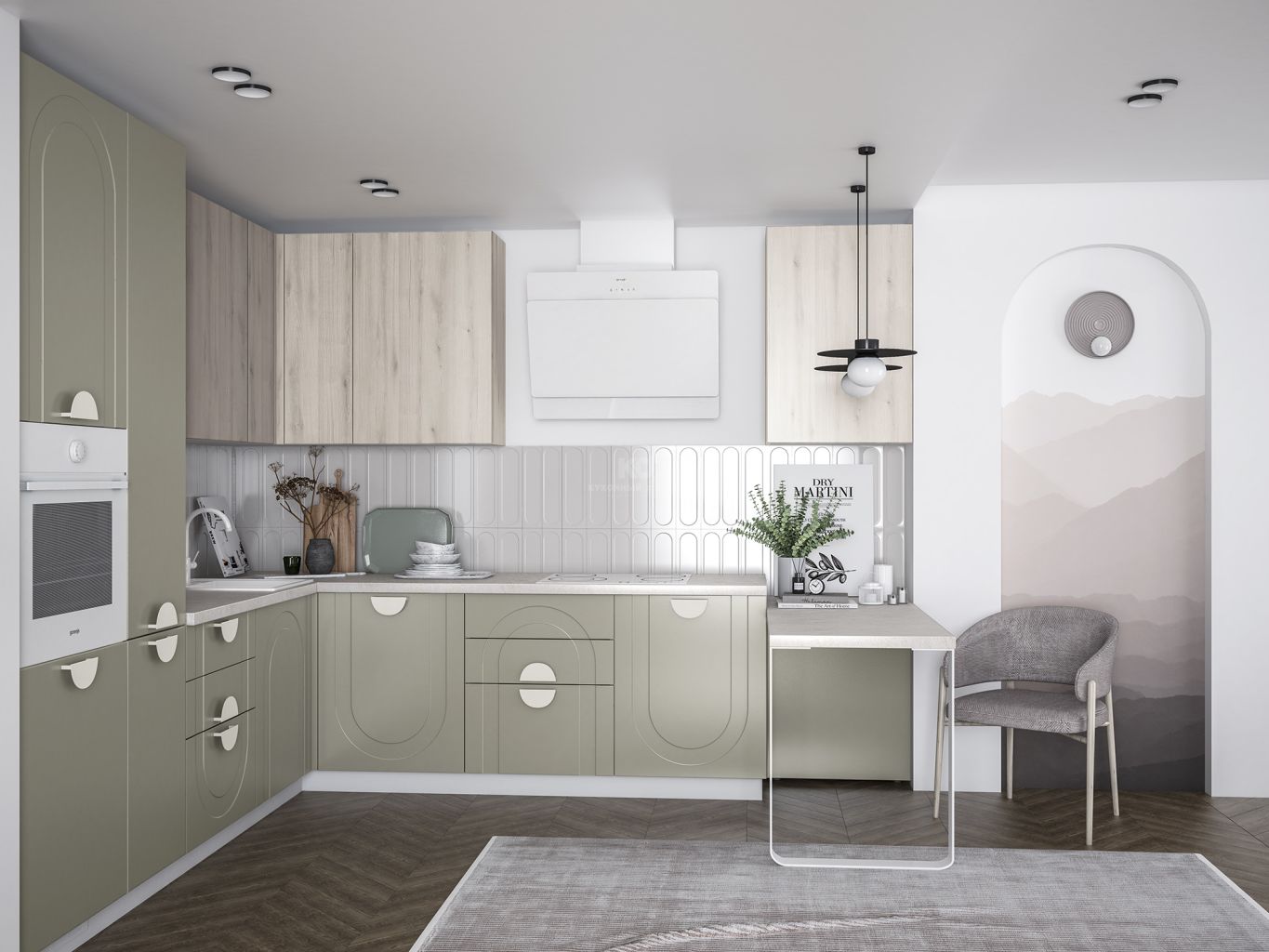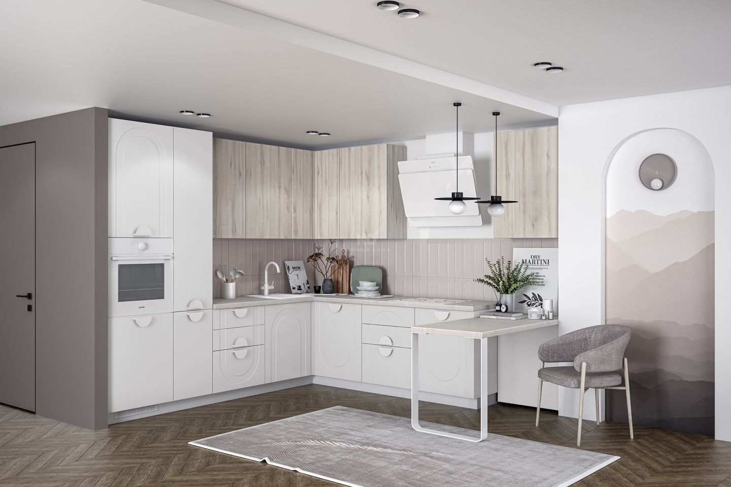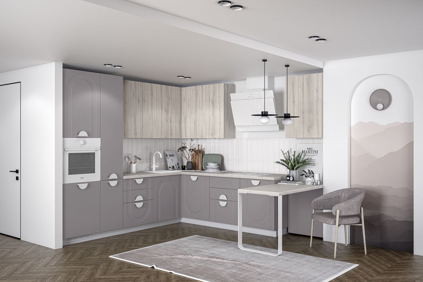 У этой фрезеровки есть свой язык вариаций. Арки можно направить вверх — для торжественного, динамичного ритма, или вниз, добавляя мягкость и камерность. Сочетание с гладкими фасадами позволяет играть с пропорциями, выделять отдельные зоны, создавать симметрию или легкую творческую асимметрию. Эта вариативность делает кухню гибкой — все зависит от того, какую тональность вы хотите задать ей и всему интерьеру.