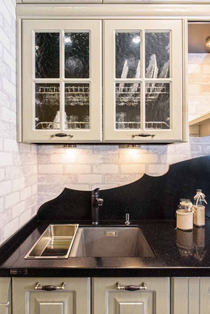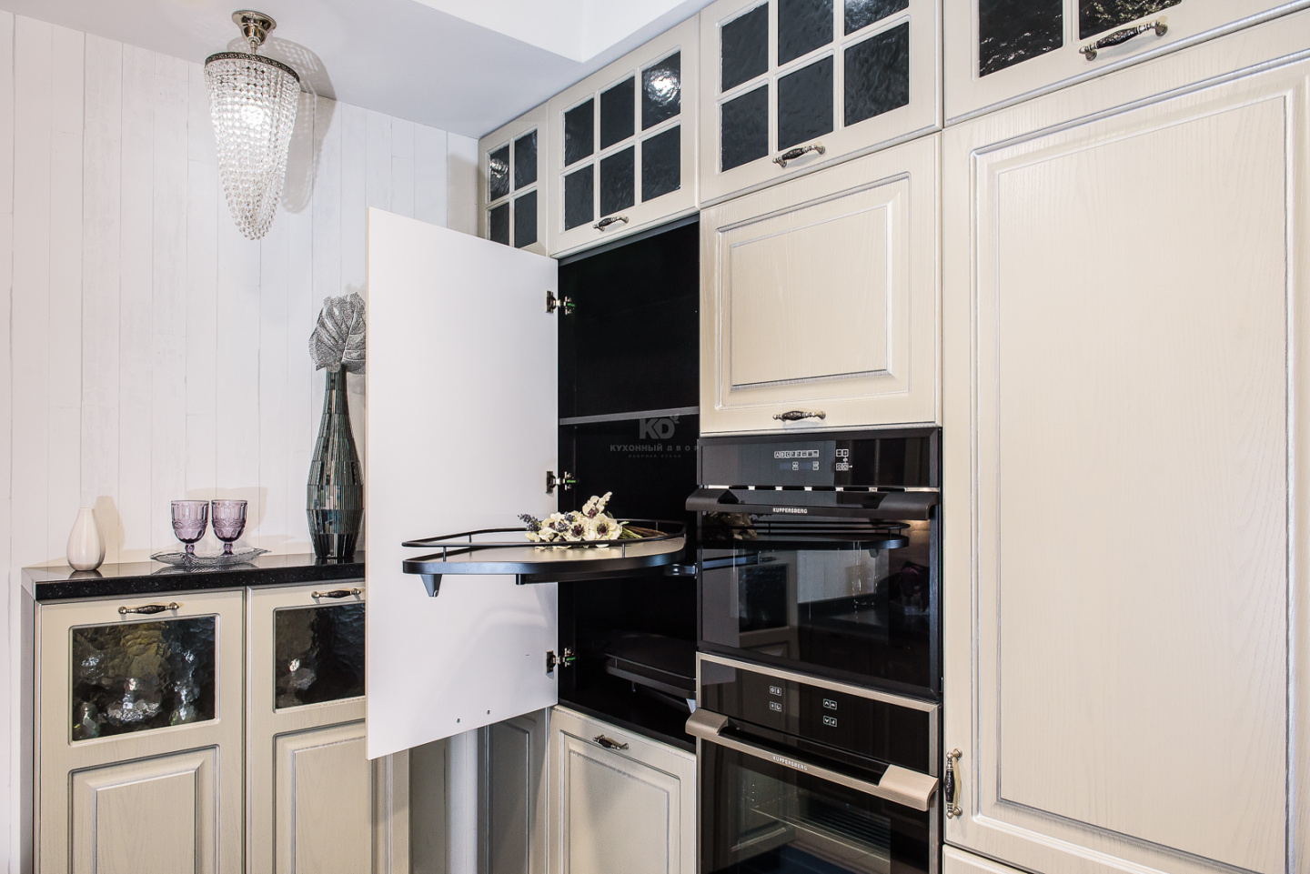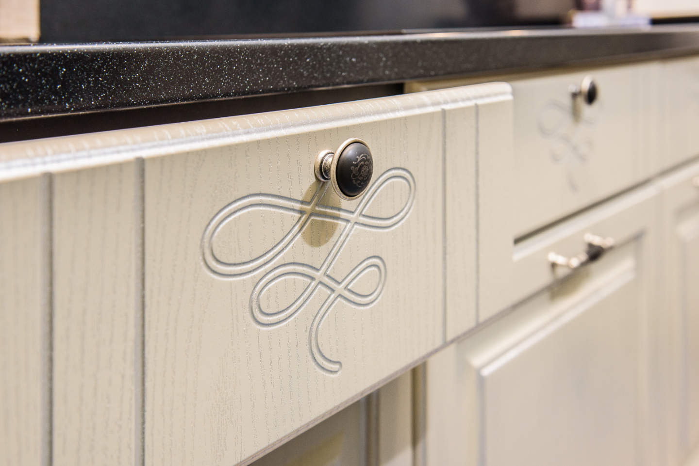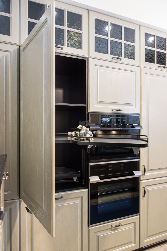 Кухня в бело-серых тонах дополнена нестандартными навесными полками и стильным декоративным карнизом, расположенным между верхними модулями. Винтажная рамка под стекло с декоративной раскладкой смотрится элегантно и дорого. Еще одной особенностью этой модели является изысканная фрезеровка, предусмотренная не только на глухих фасадах, но и на дверях со стеклом. Эта особенность выделяет гарнитур «Катарина» на фоне других кухонь в немецкой линейке Kuchen Hof.