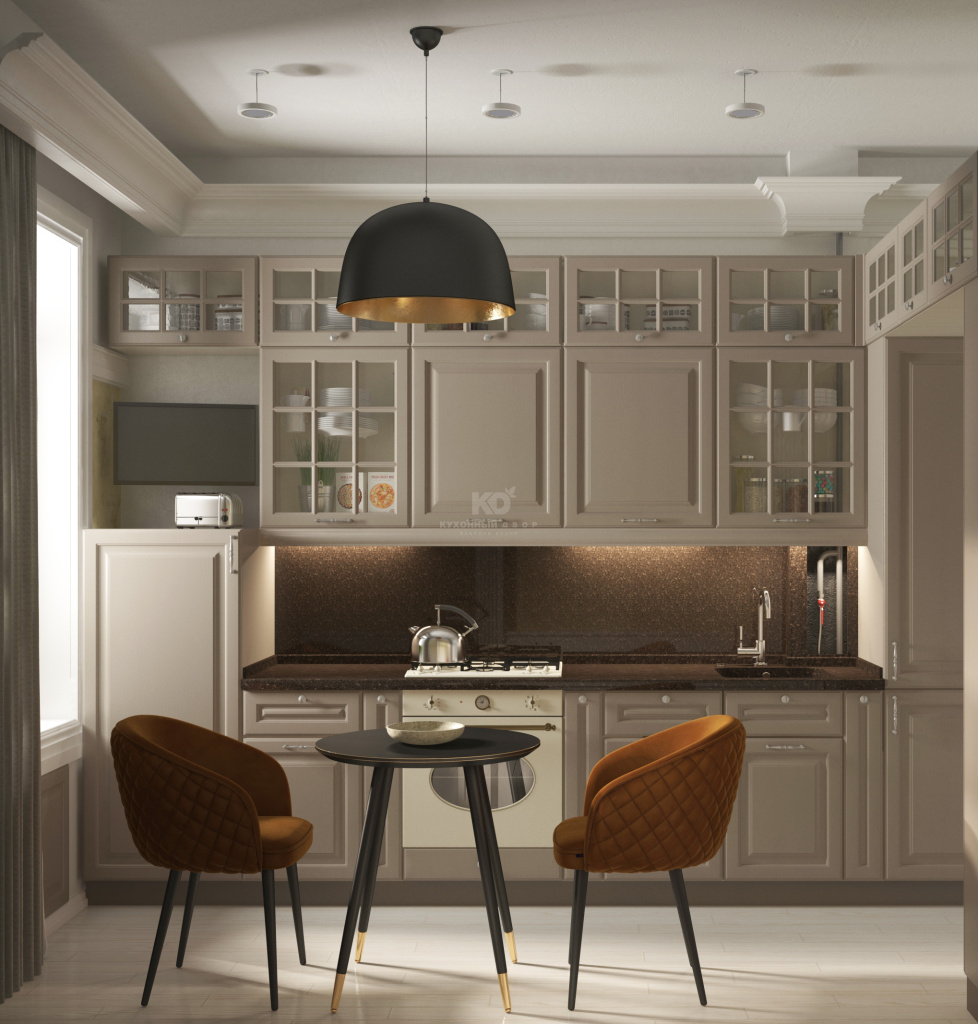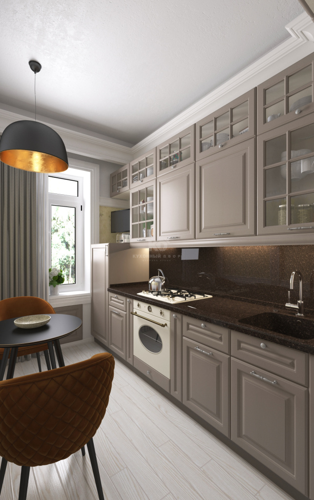Данная кухня в бело-сером цвете позволяет по-новому взглянуть на привычные черты классической мебели. Современное оформление гарнитура удивительным образом переплетается с традициями прошлых столетий: прямоугольная фрезеровка напоминает филенку классического фасада, в то время как сами фасады выполнены из высококачественной МДФ с покрытием из современного материала — экомембраны.