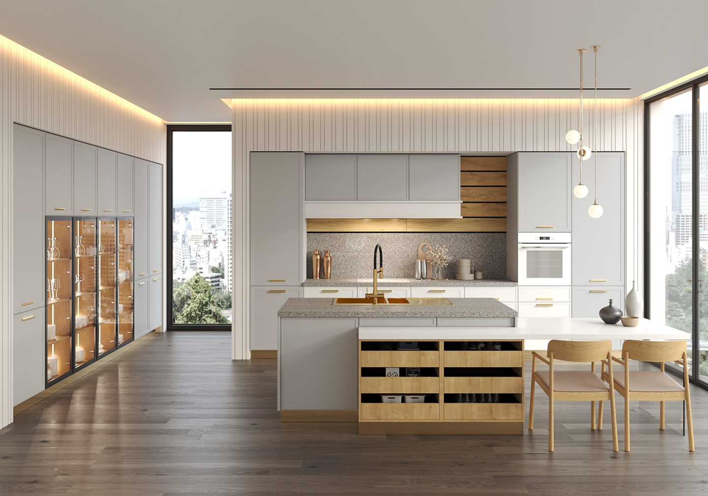 В «Рикарда Скандинавия» представлены два типа рамки фасада: широкая и узкая, изготовленные из МДФ и покрытые матовой экомембраной. Такое сочетание создает новое прочтение классики, даря модели ощущение премиальности. Это своего рода почерк мастера, тончайшая особенность, как ручная отделочная строчка на эксклюзивном пальто.