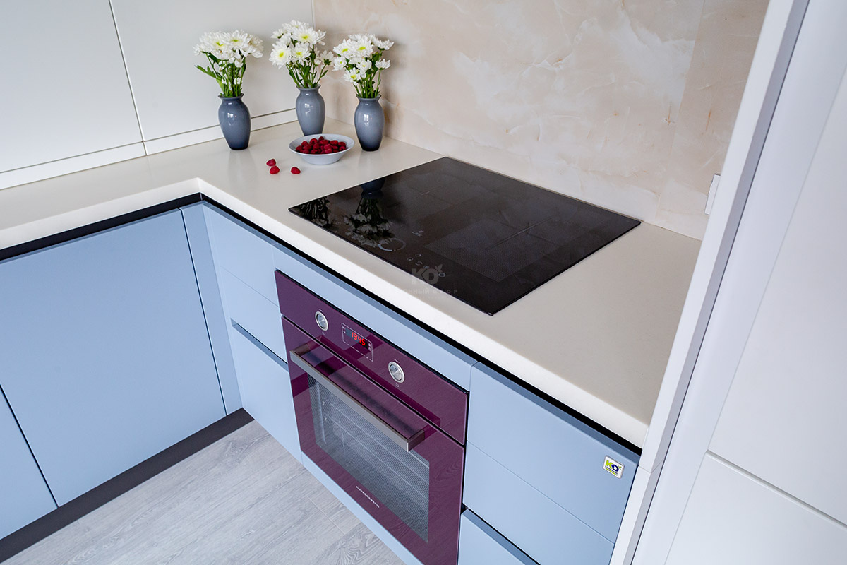 В зависимости от типа фасадов, для их открывания используются две системы – «Tip-On» и «Space Line». Первая отлично подходит для фасадов верхнего яруса и не нарушает их монолитность. А вторая подчёркивает контуры кухни и создаёт иллюзию «парящей» столешницы. Кстати, рабочая поверхность и корпус выполнены в одном цвете, поэтому кажется, будто столешница «ниспадает» на пол. Выглядит очень эффектно, особенно в сочетании со «Space Line» и графитовыми цоколями!
