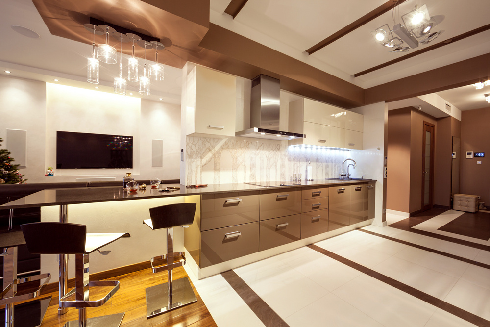 Совершенство минимализма прослеживается в оригинальных и удобных элементах интерьера — облегченной конструкции оригинальной барной стойки, стульях, дизайнерской люстре над стойкой, напоминающей перевернутые бокалы. Правильная организация пространства делает процесс нахождения на кухне максимально комфортным.