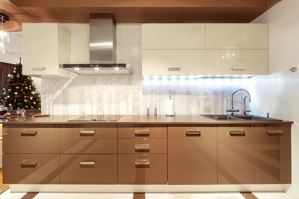 Задача: сконструировать и создать современную, практичную и удобную кухню с учетом таких особенностей интерьера, как отсутствие естественного освещения, параллельное расположение стен, вдоль которых нужно разместить фасады гарнитура.