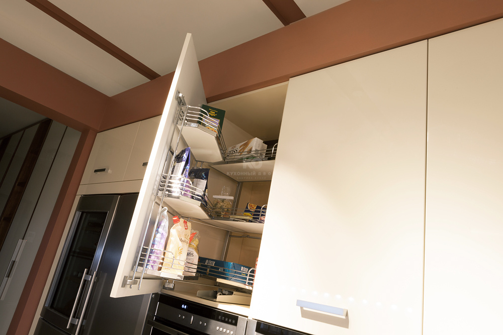 Решение: в помещении, которое изначально не было предусмотрено для размещения кухни, все же получилось создать очень красивый и современный кухонный интерьер. Несмотря на отсутствие окон, кухня не выглядит темной. Такие элементы общего декора, как белый потолок и белый пол визуально расширяют пространство. Легкость и нежность интерьера, выполненного в урбанистическом стиле, привносит удачное сочетание белого, золотистого и серебристого цветов. Пристрастие к техническому минимализму прослеживается в единстве отдельных современных элементов: фасадах бытовой техники из нержавеющей стали, хромированных ручках и смесителях. Здесь дизайн переходит в технику, образуя целостное пространство кухни.