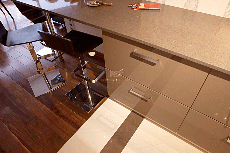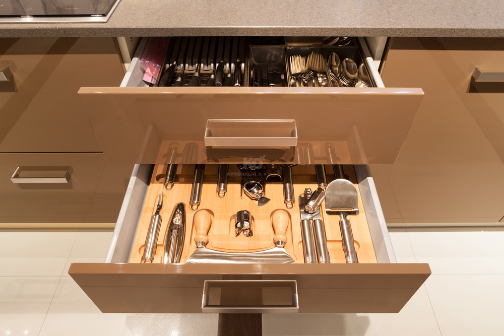Фасады гарнитура выполнены из MDF, покрытых эмалью с высоким глянцем. Благодаря инновационной многоэтапной системе обработки фасадов STRONGCOAT с большим количеством слоев грунта, лака и промежуточным шлифованием, фасады получают уникальные свойства: абсолютную устойчивость к истиранию, механическим и температурным воздействиям.