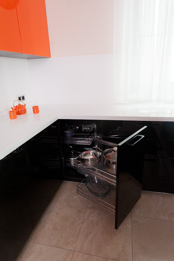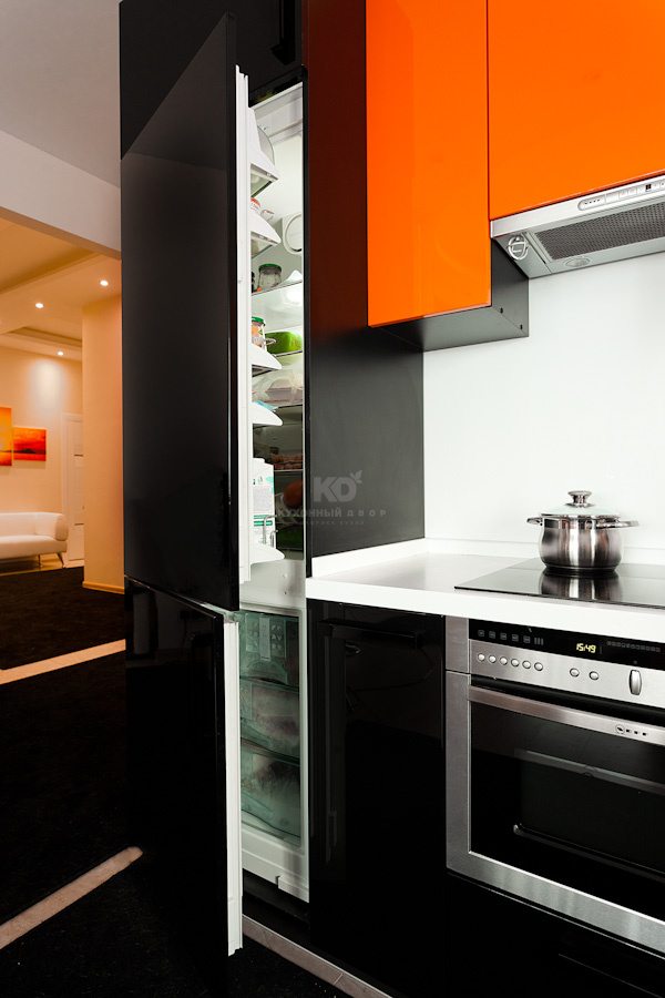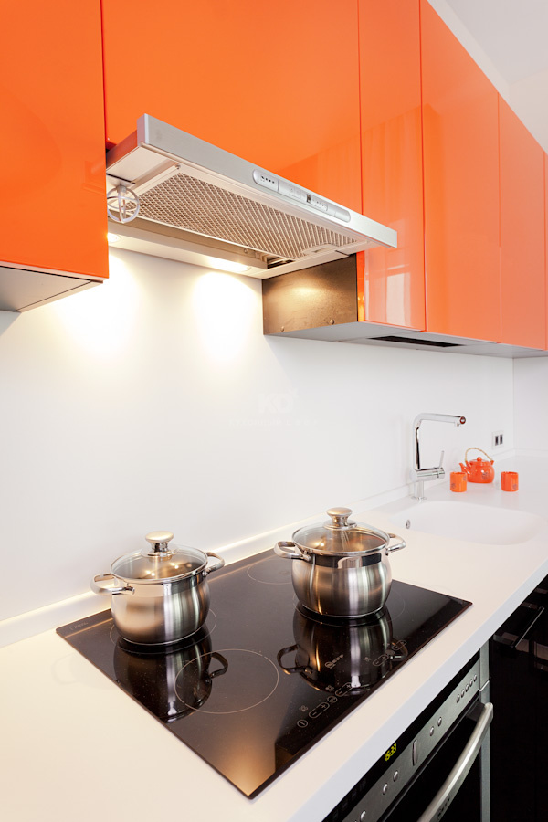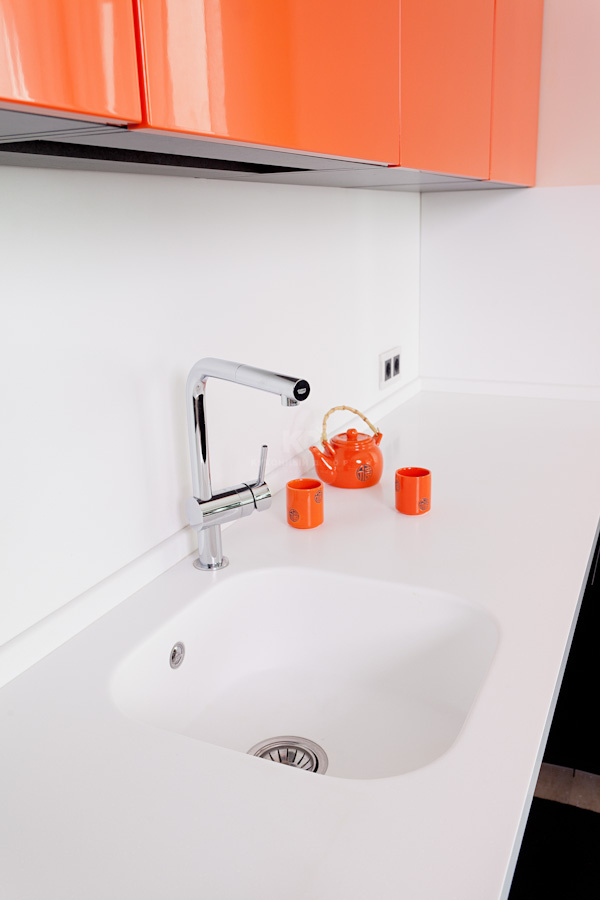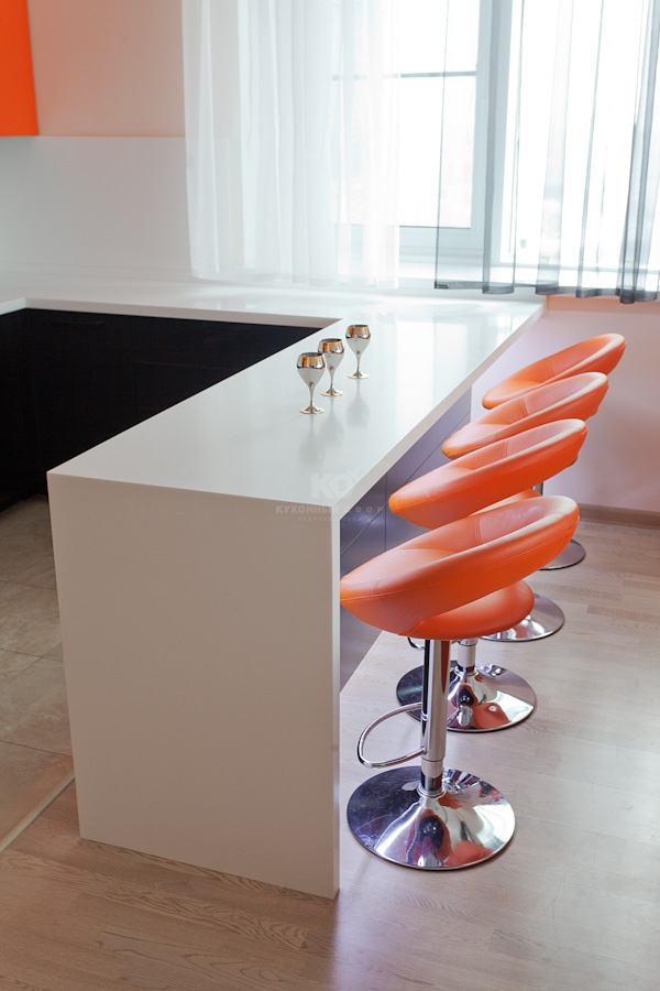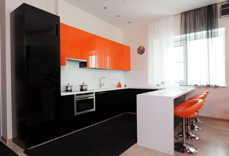 Эта кухня ярко демонстрирует последние тенденции современного дизайна. Контрастные цвета глянцевой поверхности фасадов, отсутствие ручек (дверцы открываются при помощи системы Tip-On), прямые лаконичные формы, - все это подчеркивает правильность выбранного стиля. Фасады, несмотря на свою простоту, скрывают за собой ультрасовременную начинку. Здесь и разнообразная техника, и выкатные сетки и волшебный уголок, позволяющий использовать внутреннее пространство с максимальной пользой. Нельзя оставить без внимания столешницу из искусственного камня и литую мойку, ухаживать за такой поверхностью очень просто. Завершает образ кухни барная стойка, как неотъемлемая часть интерьера квартиры крупного мегаполиса.