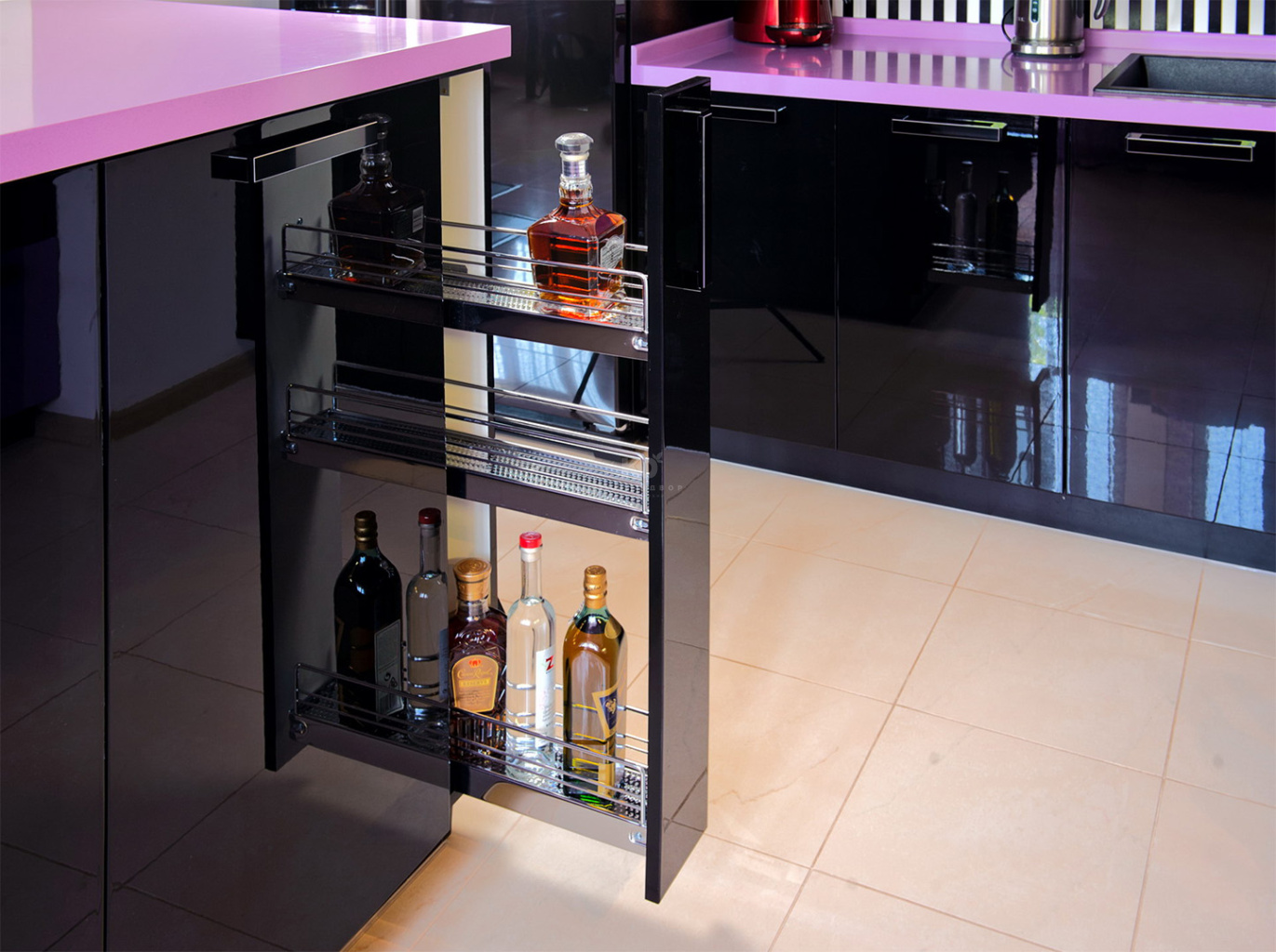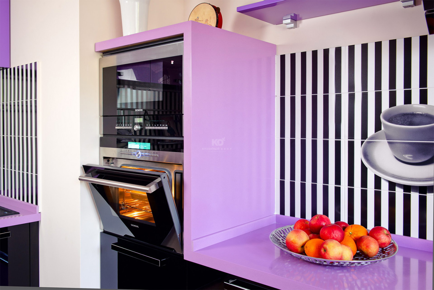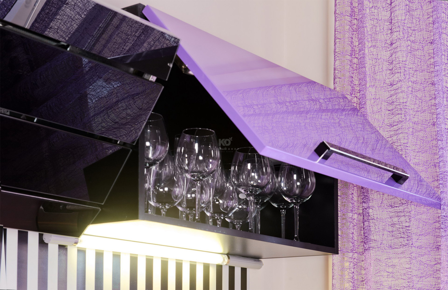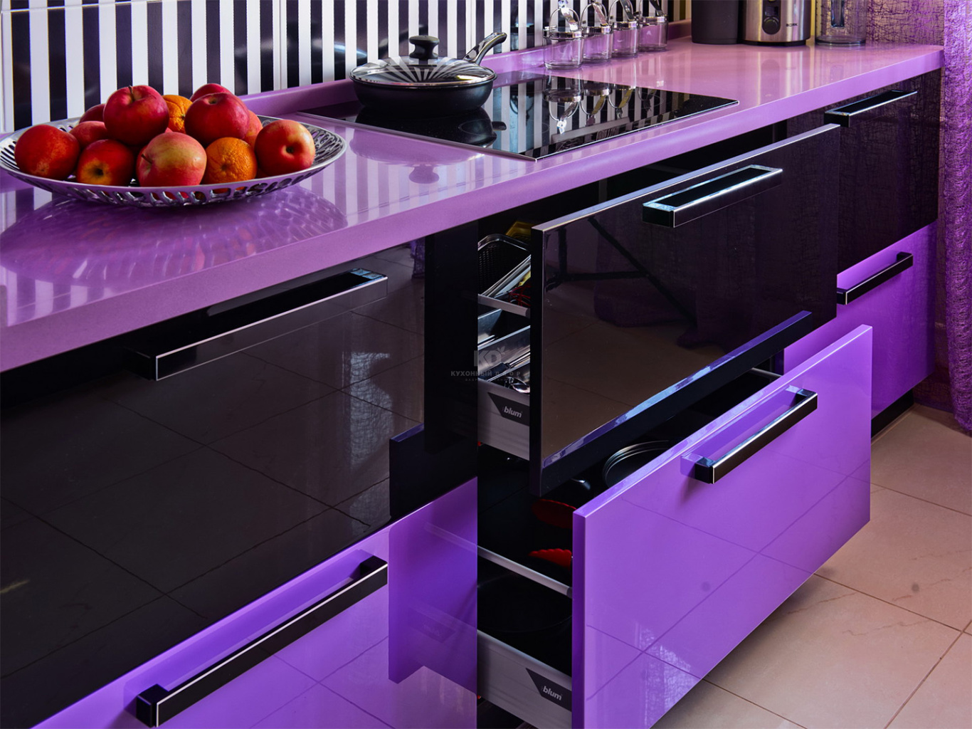 Яркий фиолетовый цвет отлично подчеркнут стильным чёрным, а лиловое полотно столешницы -своеобразный цветовой акцент, являющийся символической границей. Богатый функционал гарнитура спрятан за лаконичными фасадами с длинными ручками. В центре всей композиции - барная стойка с чёрными стульями.