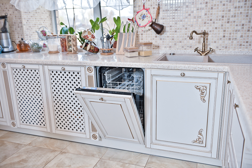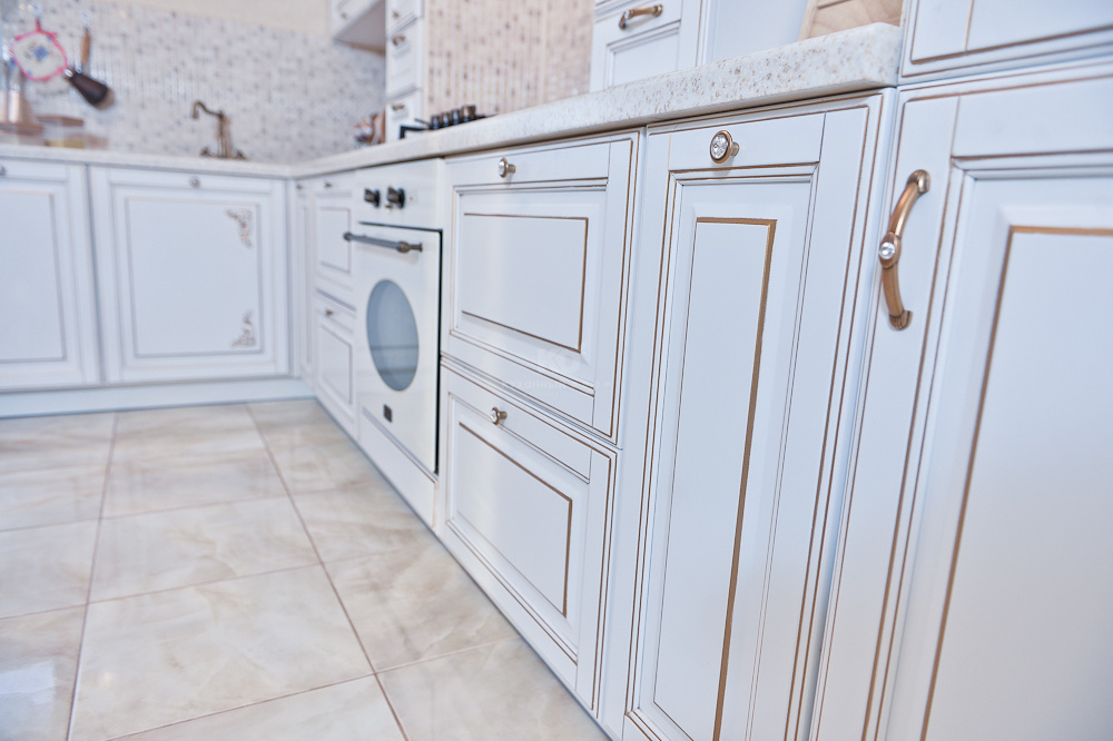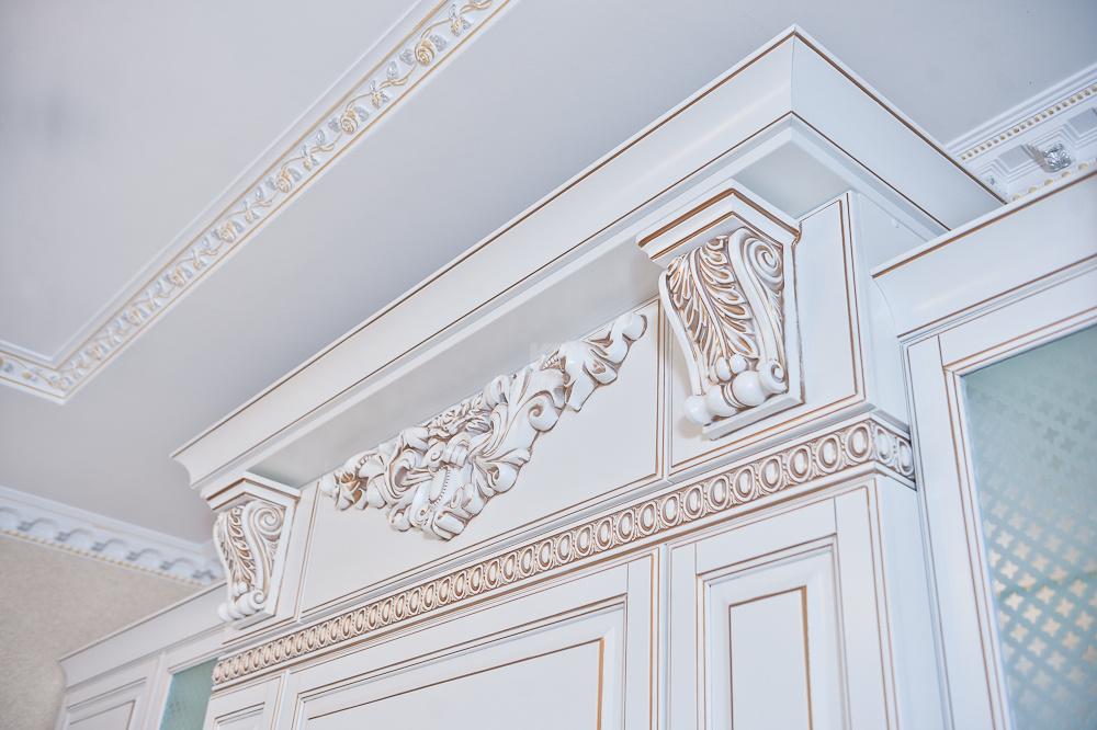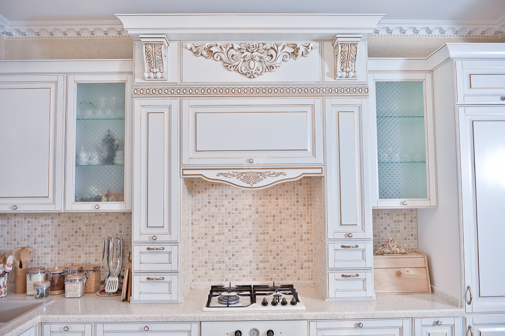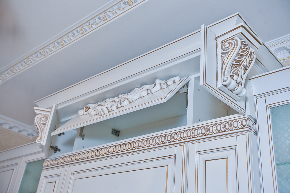 Функциональные элементы гарнитура тоже оформлены в стиле неоклассицизма — великолепно выполнен портал со встроенной вытяжкой. Портал оборудован двумя вертикальными рядами шкафчиков и встроенной вытяжкой, украшен кокошником, декоративной лепниной с патиной и увенчан великолепным карнизом.