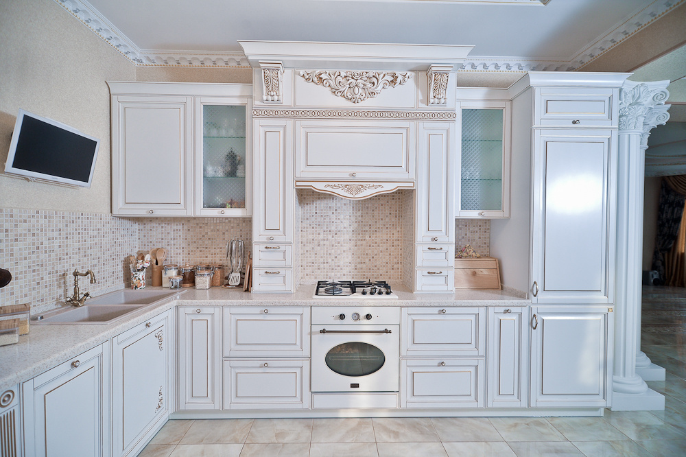 Задача: Хозяева просторного и светлого интерьера остановили свой выбор на гарнитуре «Виконт», выполненном в стиле неоклассицизма. В образе модели «Виконт» нашли отражение вкусовые предпочтения хозяев — роскошные фасады из натурального дерева, светлая цветовая палитра и великолепные художественные детали.