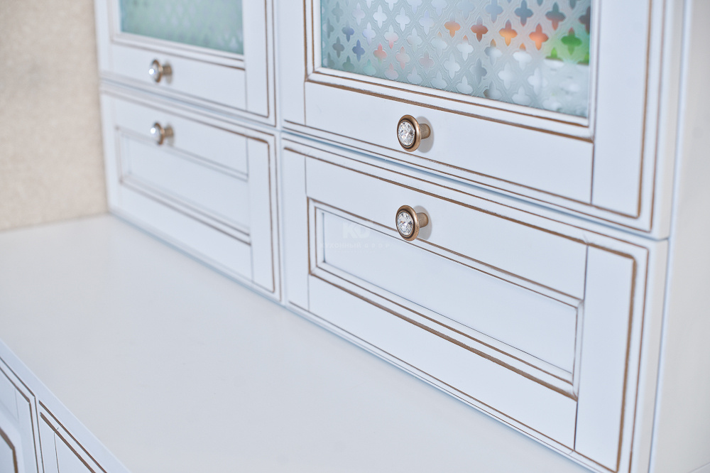 Модель в светлом исполнении изысканна и нежна. Белоснежные фасады выполнены из массива бука с отделкой матовым лаком и золотой патиной. Гарнитур украшен и дополнен множеством декоративных деталей, которые подчеркивают индивидуальность стиля кухни. Пилястры «Грация», позолоченные ручки с кристаллами Swarovski, декоративные витражи с пескоструйной обработкой «Ромб», красивые карнизы привносят торжественность в общий композиционный рисунок гарнитура.