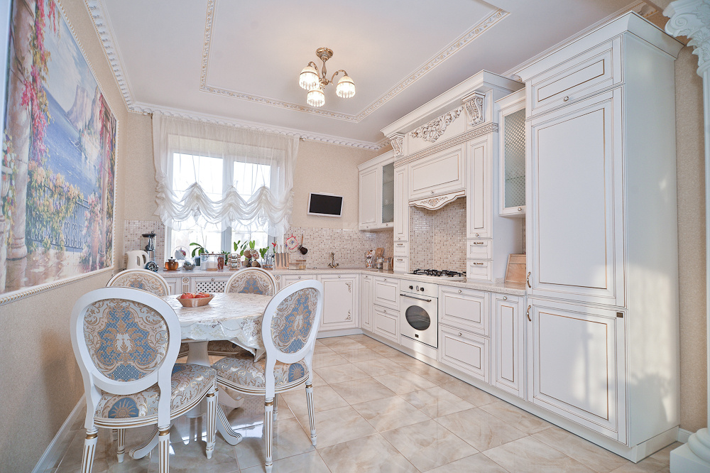 Результат: Благодаря выбору кухонного гарнитура «Виконт», в интерьере просторной кухни хозяевам великолепного дома удалось воссоздать восхитительную атмосферу загородной резиденции королевской знати.