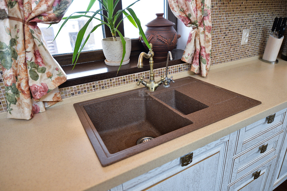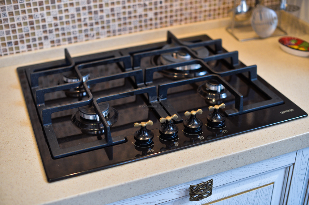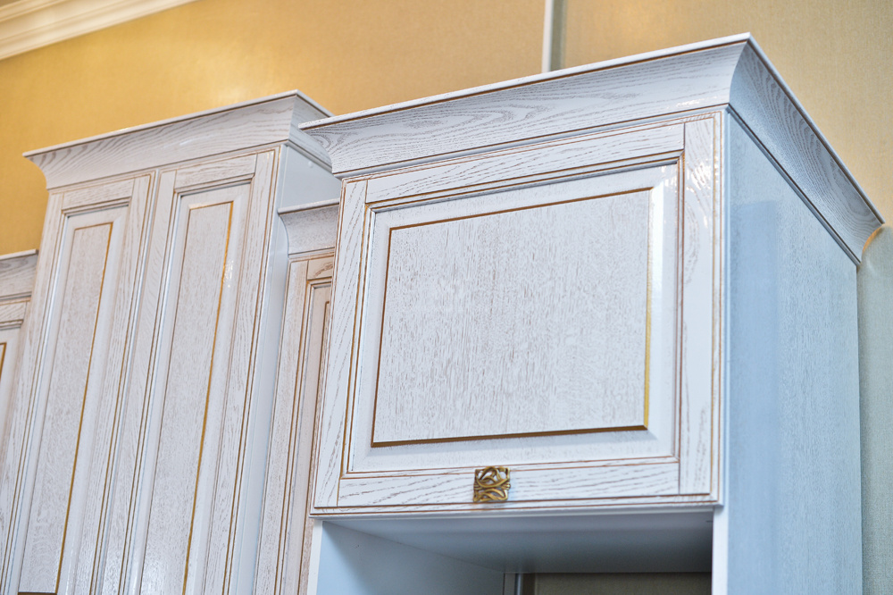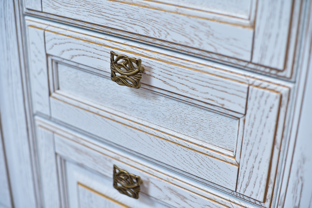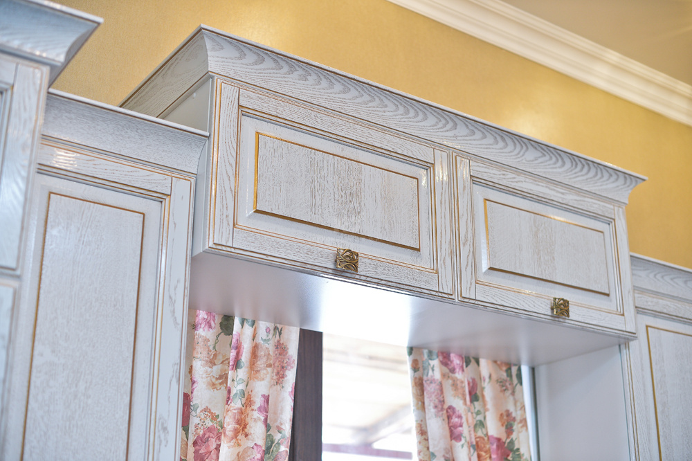 «Виконт», действительно, статусный гарнитур. Белоснежные фасады из натурального бука покрыты матовым лаком и золотой патиной. Технология патинирования фасадов — сложный многоступенчатый процесс, в результате которого структура древесины обретает неповторимый благородный оттенок. Под стать торжеству высокого стиля — небольшие, но важные детали: изысканные ручки, декоративные балясины, элегантный карниз, разноуровневое расположение верхних модулей. Встроенная техника подобрана с учетом стилистических особенностей гарнитура — с элементами «ретро». Обращает на себя внимание функциональная каменная мойка с двумя чашами. Великолепное дополнение и украшение кухни — мозаичное панно удивительной красоты!