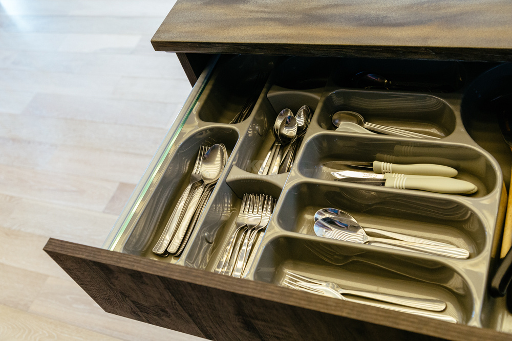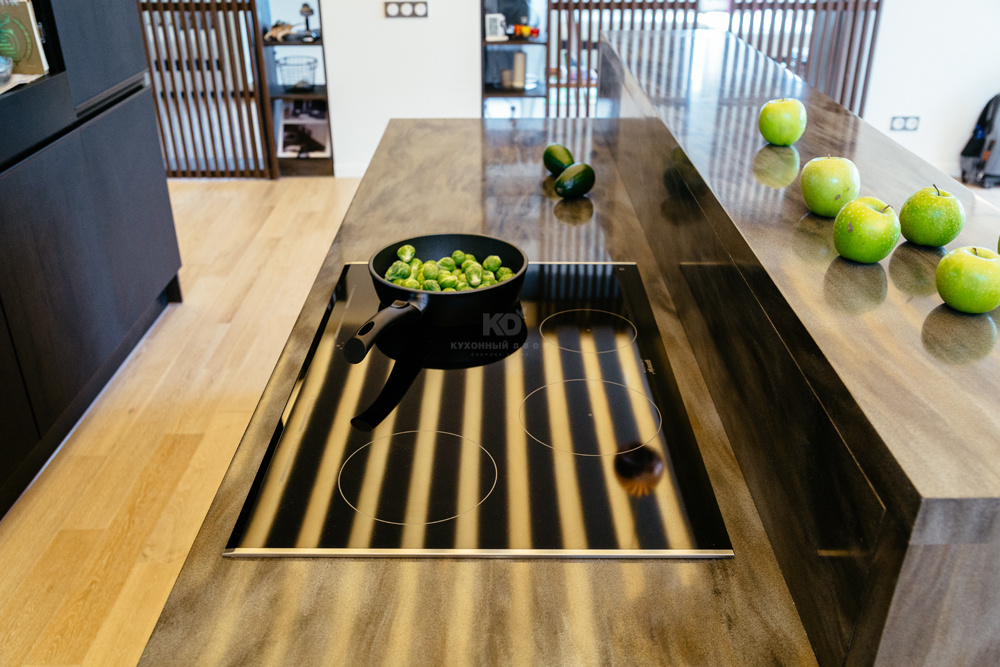 Эффектный остров тоже многофункциональный, в нем есть большой вместительный выдвижной ящик, в который легко поместятся крупные кастрюли, казаны и кастрюли. Над варочной панелью установлена вытяжная система, ее роль выполняют два вентилятора. Установку в действие приводит интеллектуальный датчик влажности. Модель очень экономична.