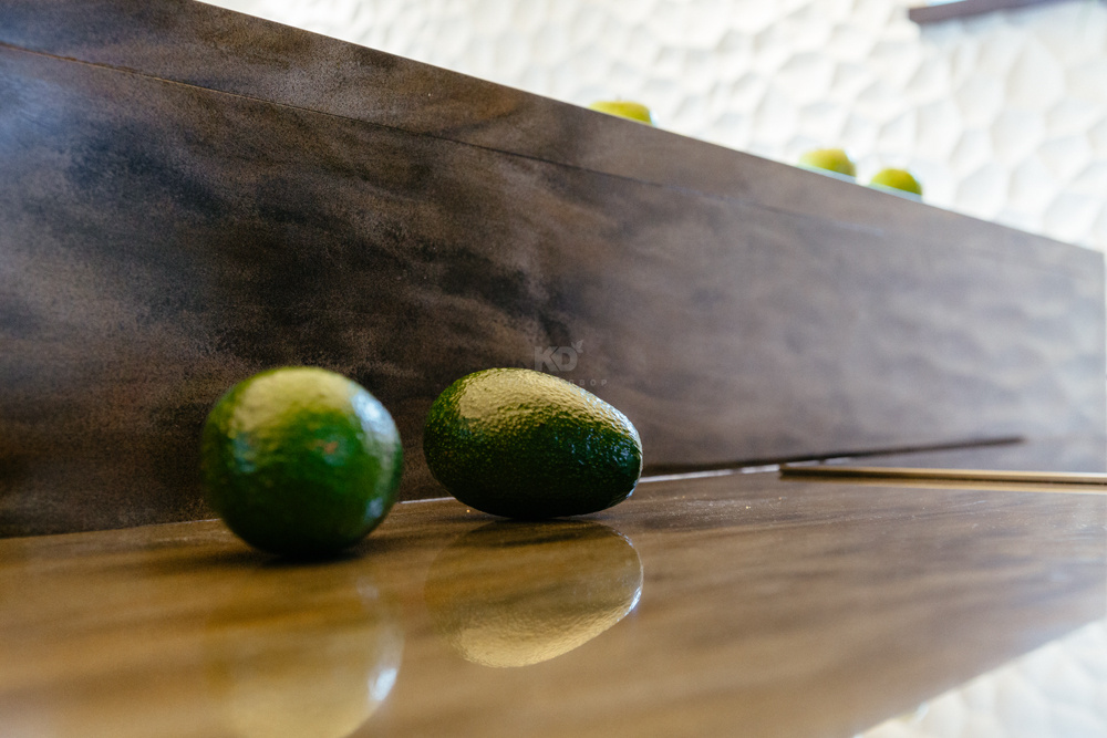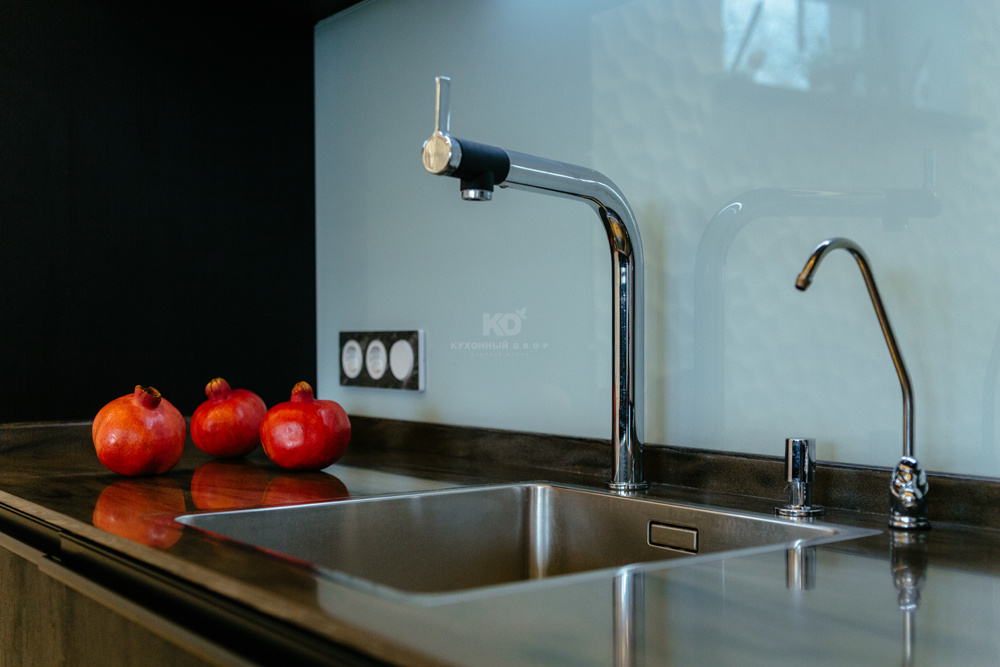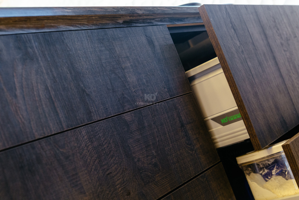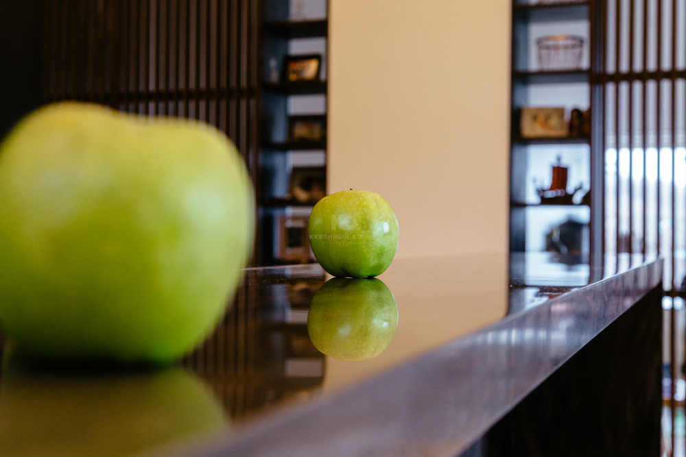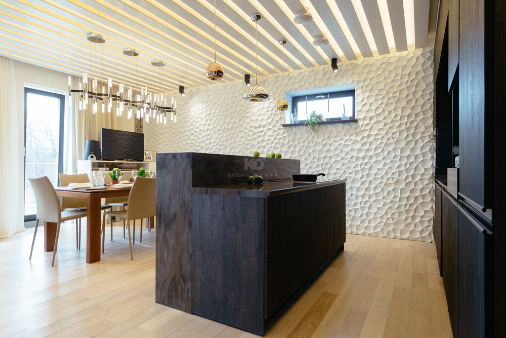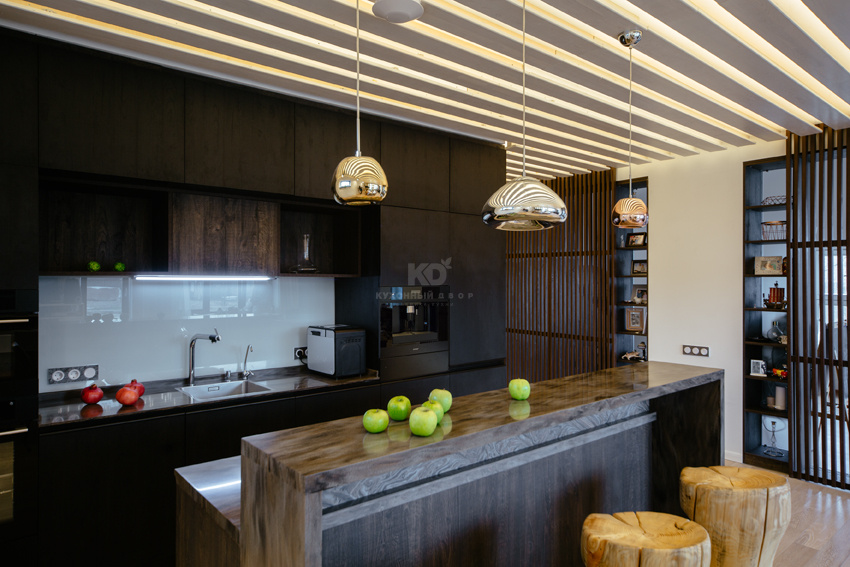 Фасады модели выполнены из так называемых экомассива шоколадного, почти черного цвета. Экомассив — это новое поколение современных, экологически чистых конструкционно-отделочных материалов, получаемых особым способом прессования слоистых пластиков на древесные плиты (ДСП, MDF). Материал сочетает в себе пластик и древесную основу. Он влагостойкий, не деформируется со временем и очень практичен. Плиты выполнены с глубоким тиснением, как у ценных пород древесины — бука или дуба — прикасаться к такой поверхности одно удовольствие. На фоне светлой отделки стены темные фасады кухонного гарнитура, остров и барная стойка смотрятся весьма эффектно.