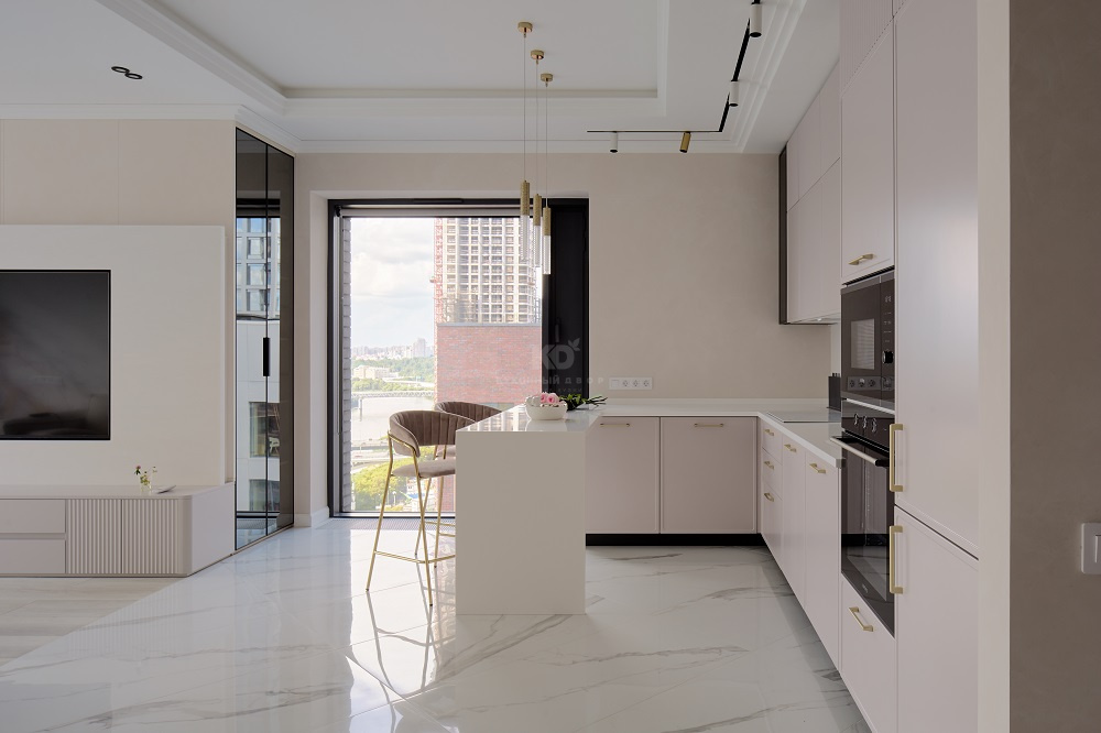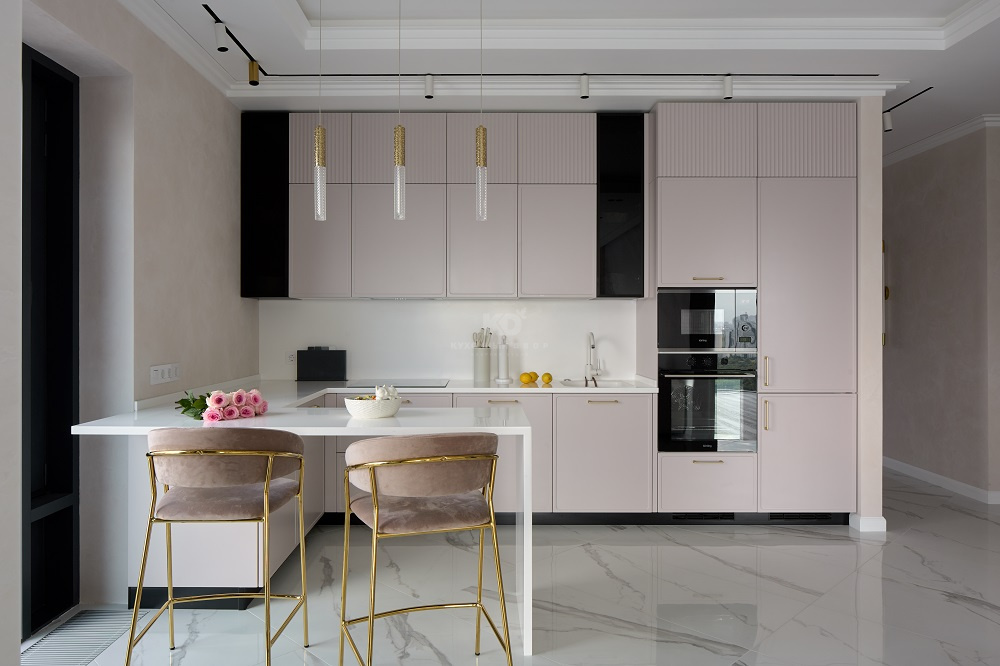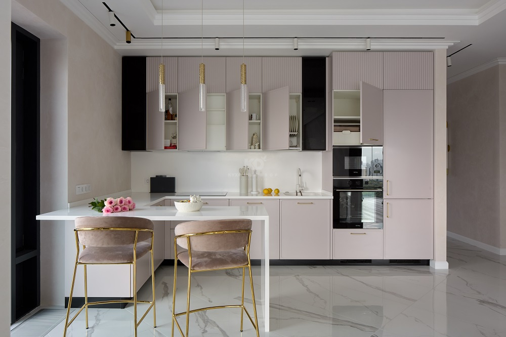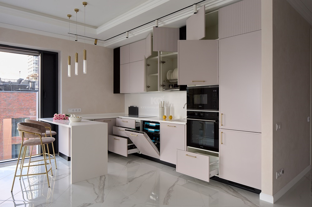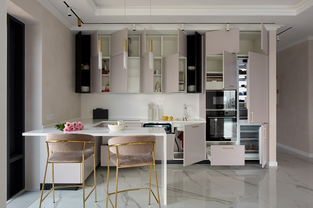 Эргономика этой кухни позволяет творить кулинарные шедевры с магической лёгкостью! «Джейн Арт» Сергея Сафронова имеет удобную П-образную архитектуру, а также немало аксессуаров и систем хранения.
