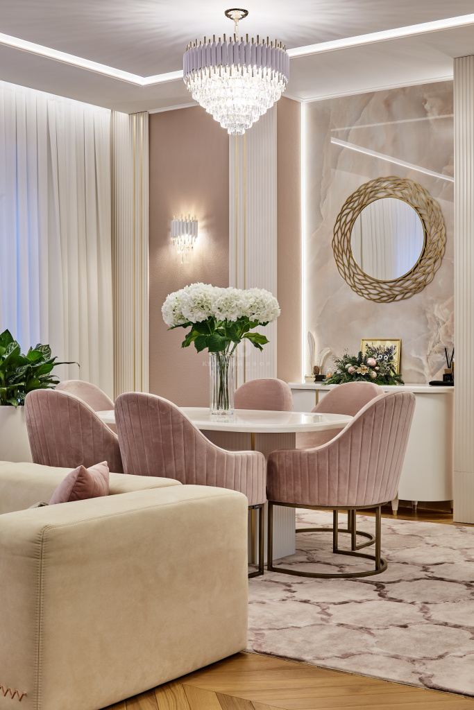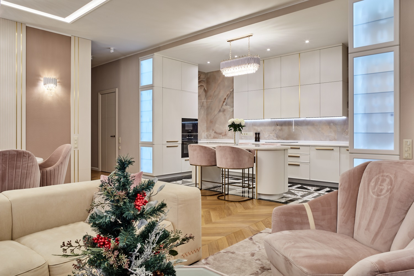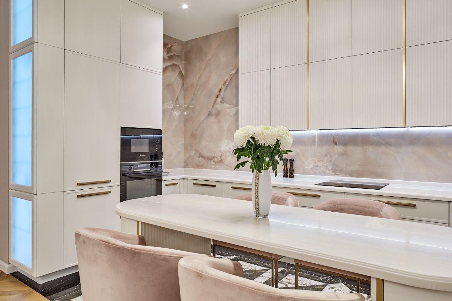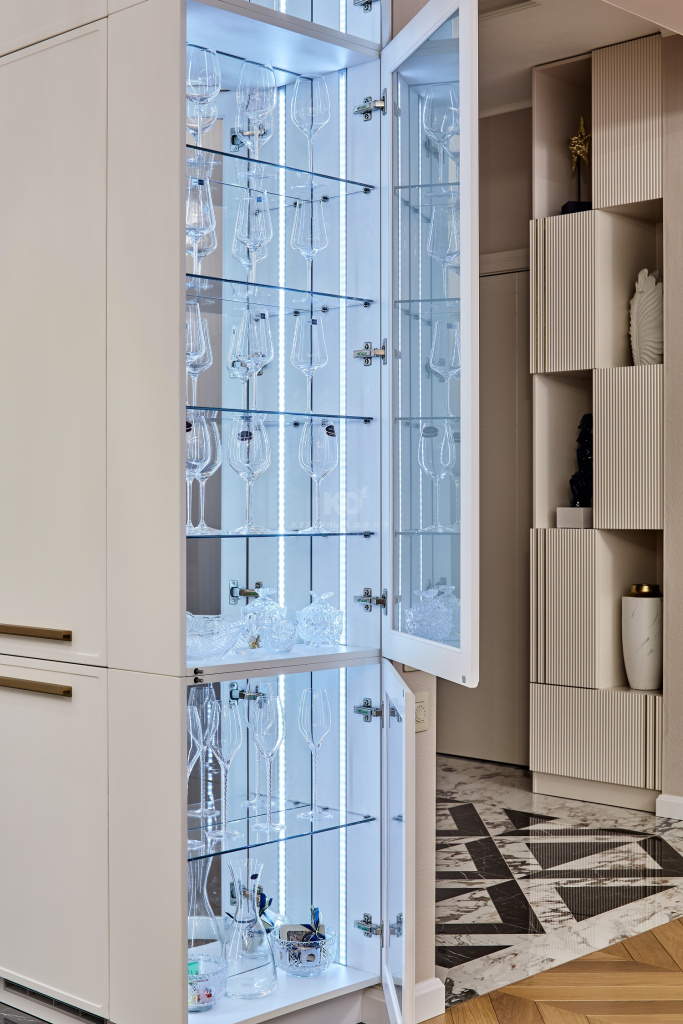 «Джейн» выполнена в три яруса и выстроена П-образно, а овальный остров с радиусными фасадами установлен в центре всей композиции. Одного взгляда на количество мебели достаточно, чтобы понять – на этой кухне нет недостатка в полезном пространстве. Огромное количество ящиков и обилие высоких пеналов позволяет хозяевам с комфортом хранить большой объём продуктов, утвари и мелкой бытовой техники. За многими фасадами скрыты современные выкатные системы хранения и удобные органайзеры. Место для хранения есть и в острове – радиусные элементы являются полноценными фасадами и могут открываться. А для особо красивой посуды предусмотрены два эффектных буфета с матированными стёклами, зеркальными задними стенками и подсветкой!