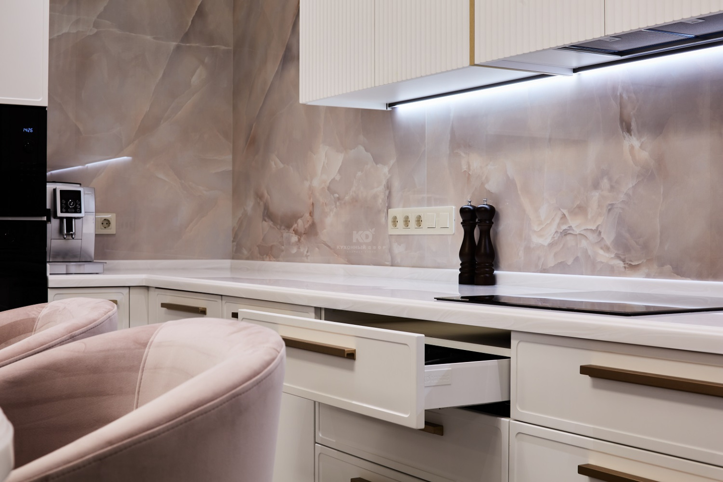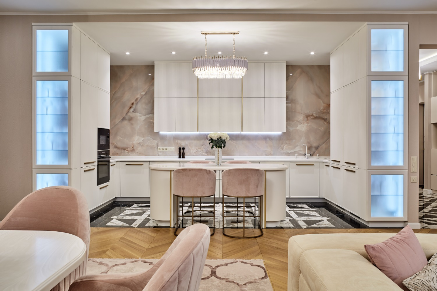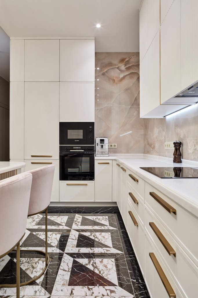 Пудрово-белоснежная П-образная кухня