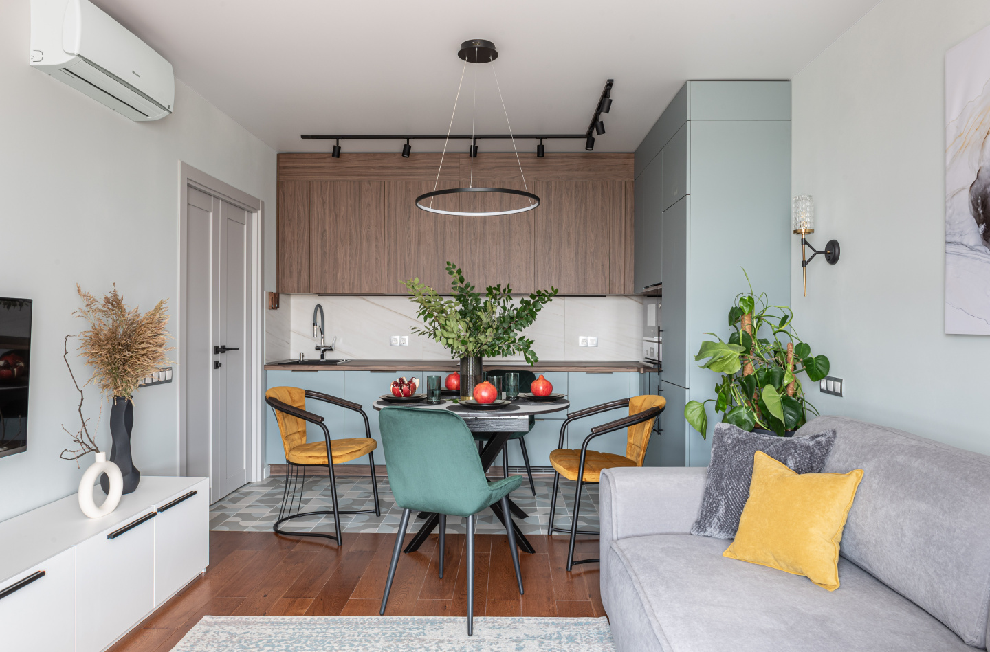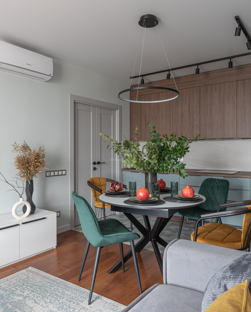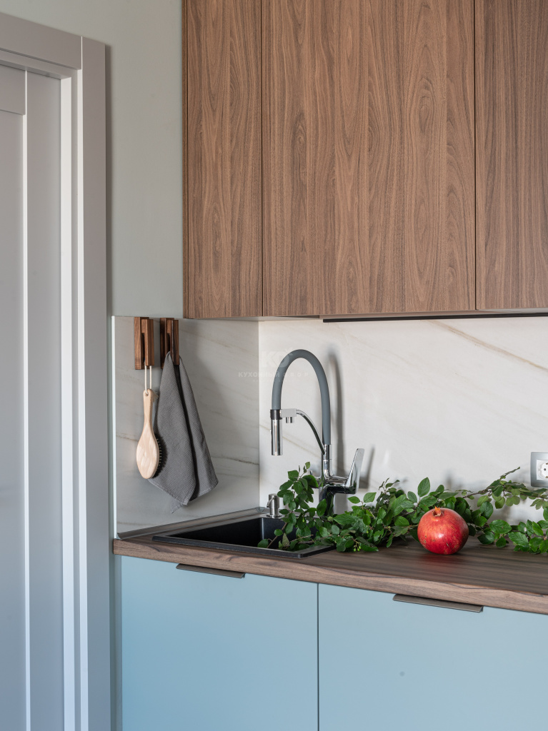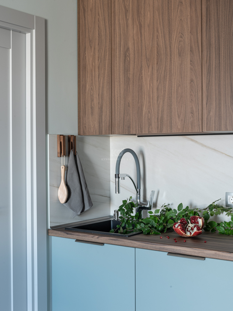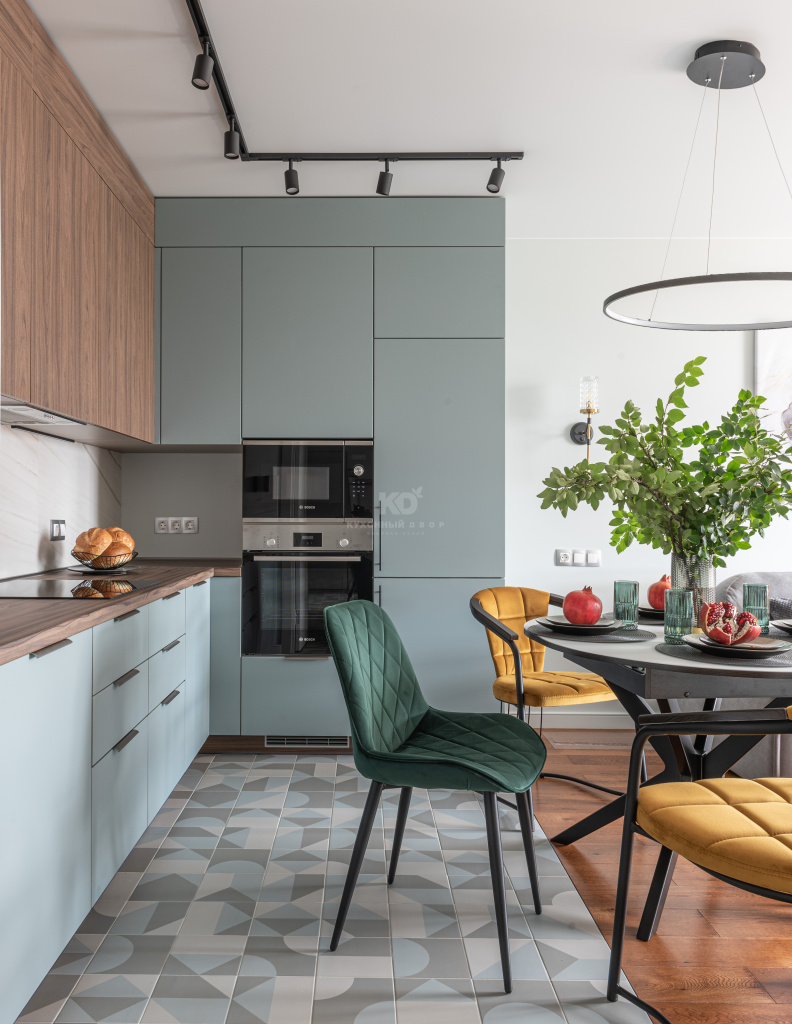Интерьер выполнен в современном стиле и дополнен яркими акцентами. В качестве основы использован материал МДФ+Экомембрана с фактурой под натуральное дерево. Это отражает тяготение современного стиля к природным материалам и минимализму в целом. Для освежения пространства дизайнеры применили дополнительно фасады модели Стоун Колор – фьёрд зеленый из экоплиты. В этом цвете выполнены фасады и одно из кресел в обеденной зоне.