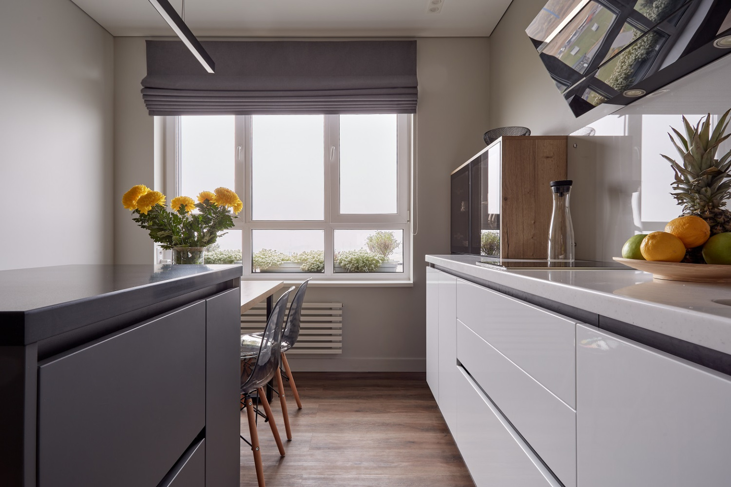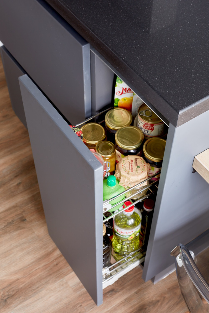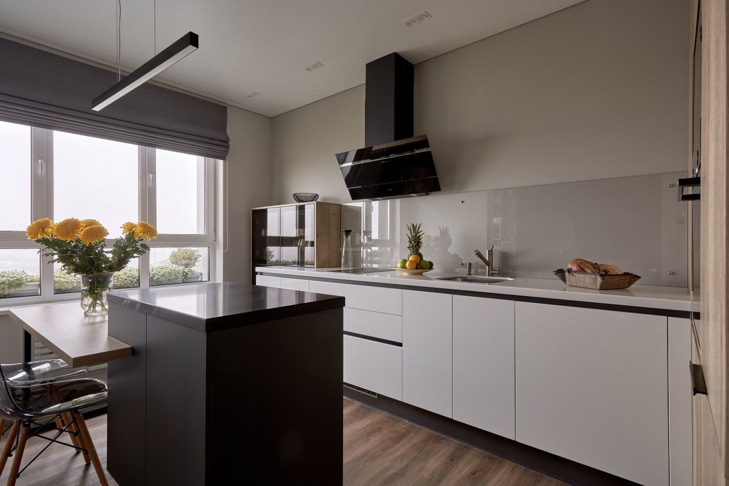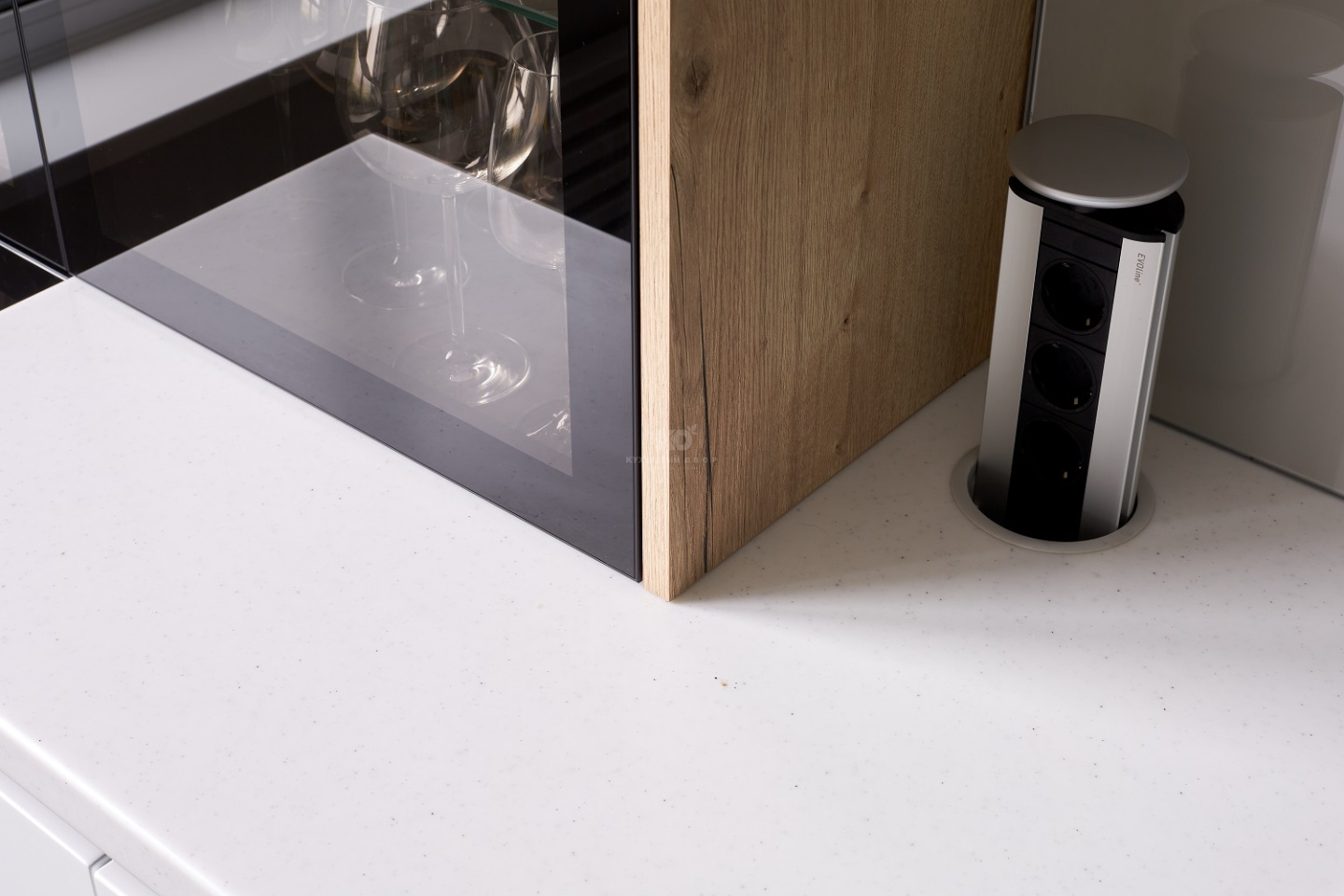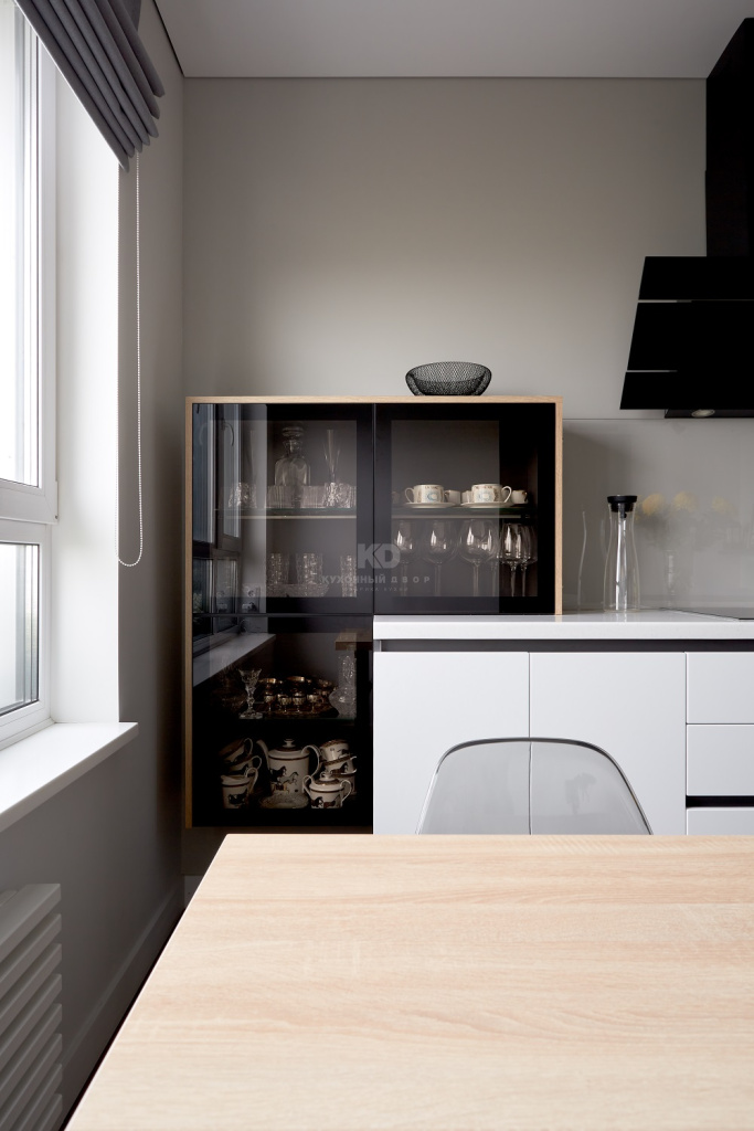 Теперь о белых и тёмных фасадах, которые проект получил от модели «Эмма». Они созданы из МДФ, покрытой экомембраной, а также оснащены системой открывания «Space Line». В этой системе функцию ручек выполняют скрытые профили, благодаря которым столешница визуально приподнимается над гарнитуром. Выглядит очень элегантно! А довершает утончённый образ отсутствие навесных шкафов, лаконичная обеденная зона и невероятно стильный застеклённый буфет от модели «Ноа», который словно парит над полом!