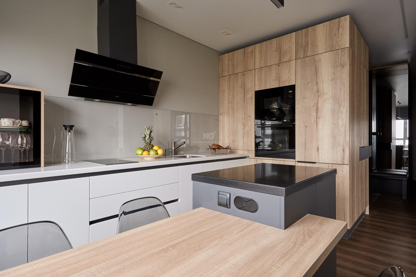 Кухня наполнена мощной энергетикой, однако выглядит удивительно лёгкой. Секрет прост: грамотная компоновка и правильное сочетание цветофактур! Так, корпус и фасады высоких пеналов здесь имеют фактуру древесины с неповторяющимся рисунком. Эти фасады достались проекту от модели «Стоун Вуд». Они созданы из лёгкой и долговечной экоплиты, которая в совершенстве имитирует натуральные текстуры визуально и тактильно. Кстати, зона, выполненная под дерево, является ещё и частью прихожей. Подробнее об этом – в видеоотзыве хозяйки!
