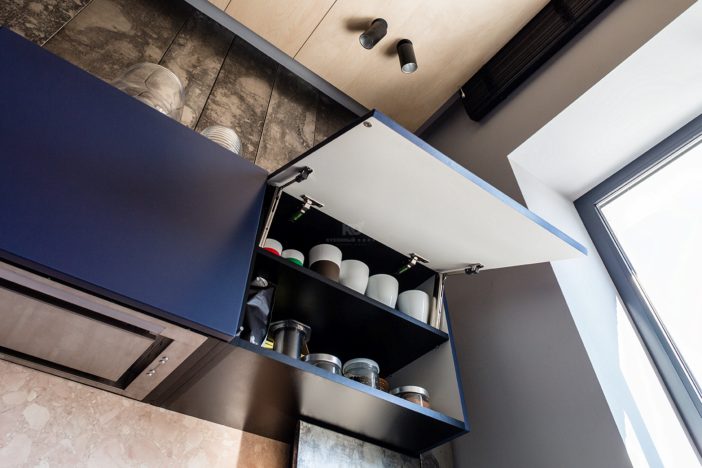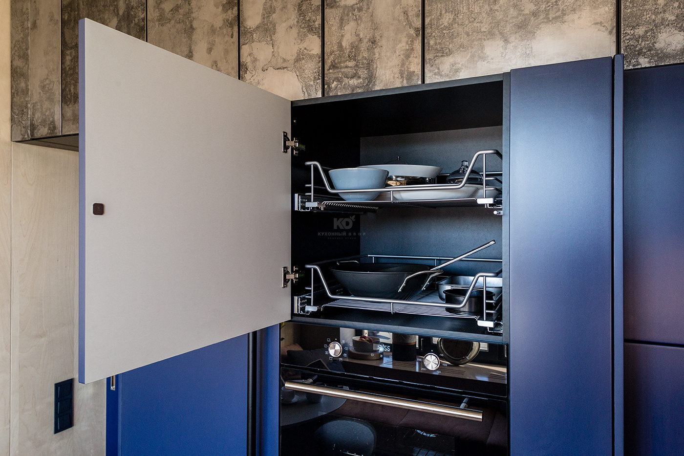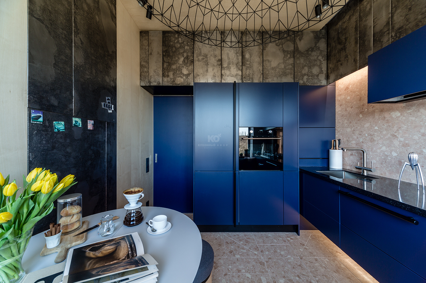 - Насыщенный синий оттенок и матовые поверхности. За счет этого мебель выглядит благородно и дорого.
