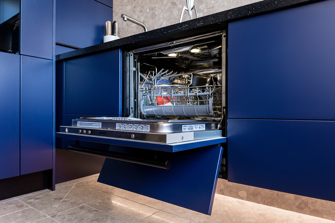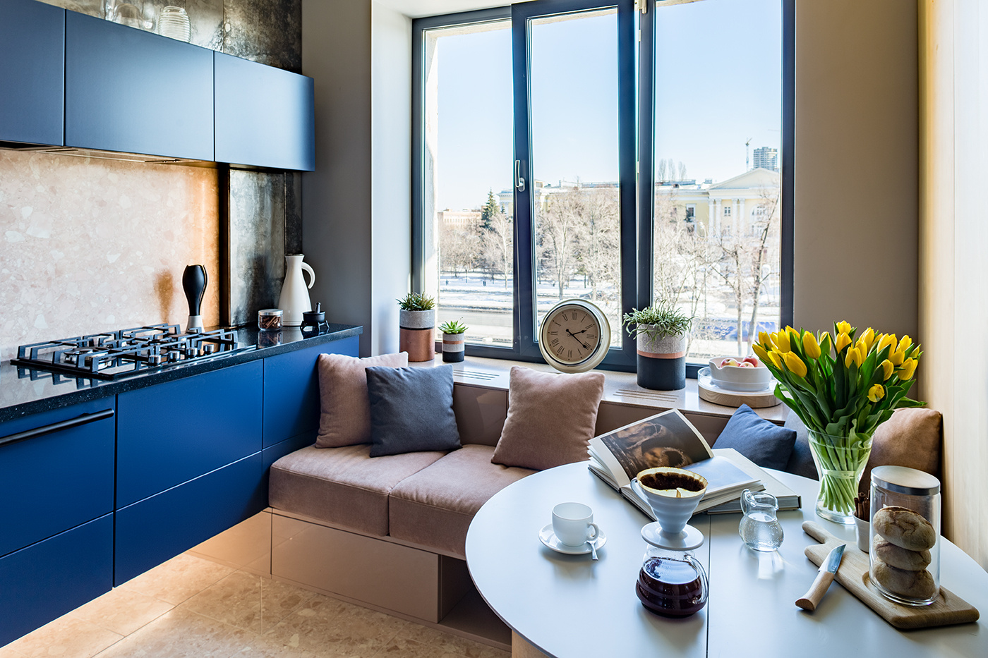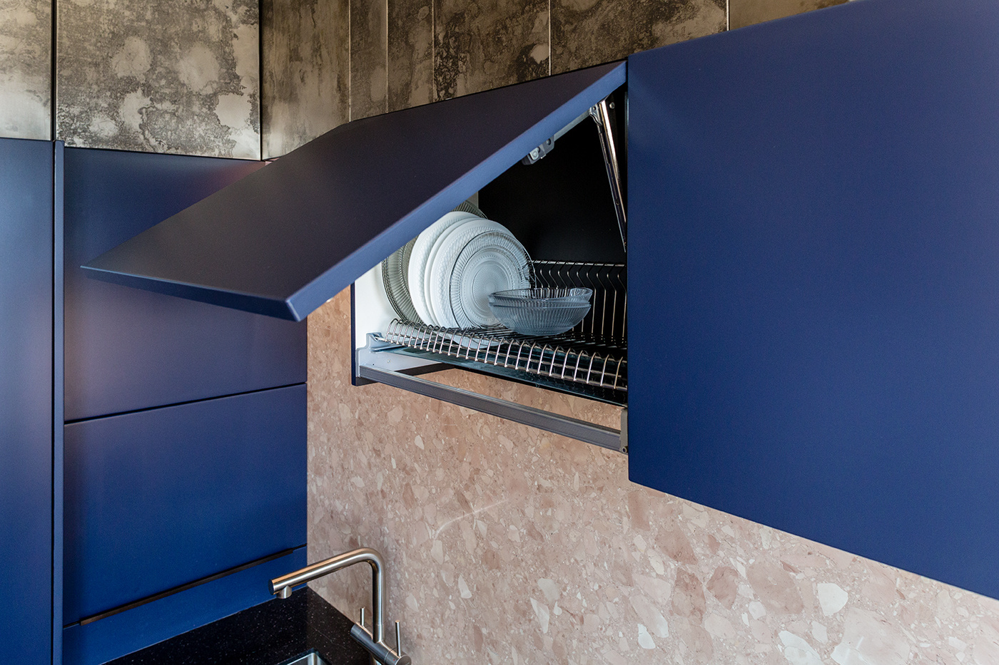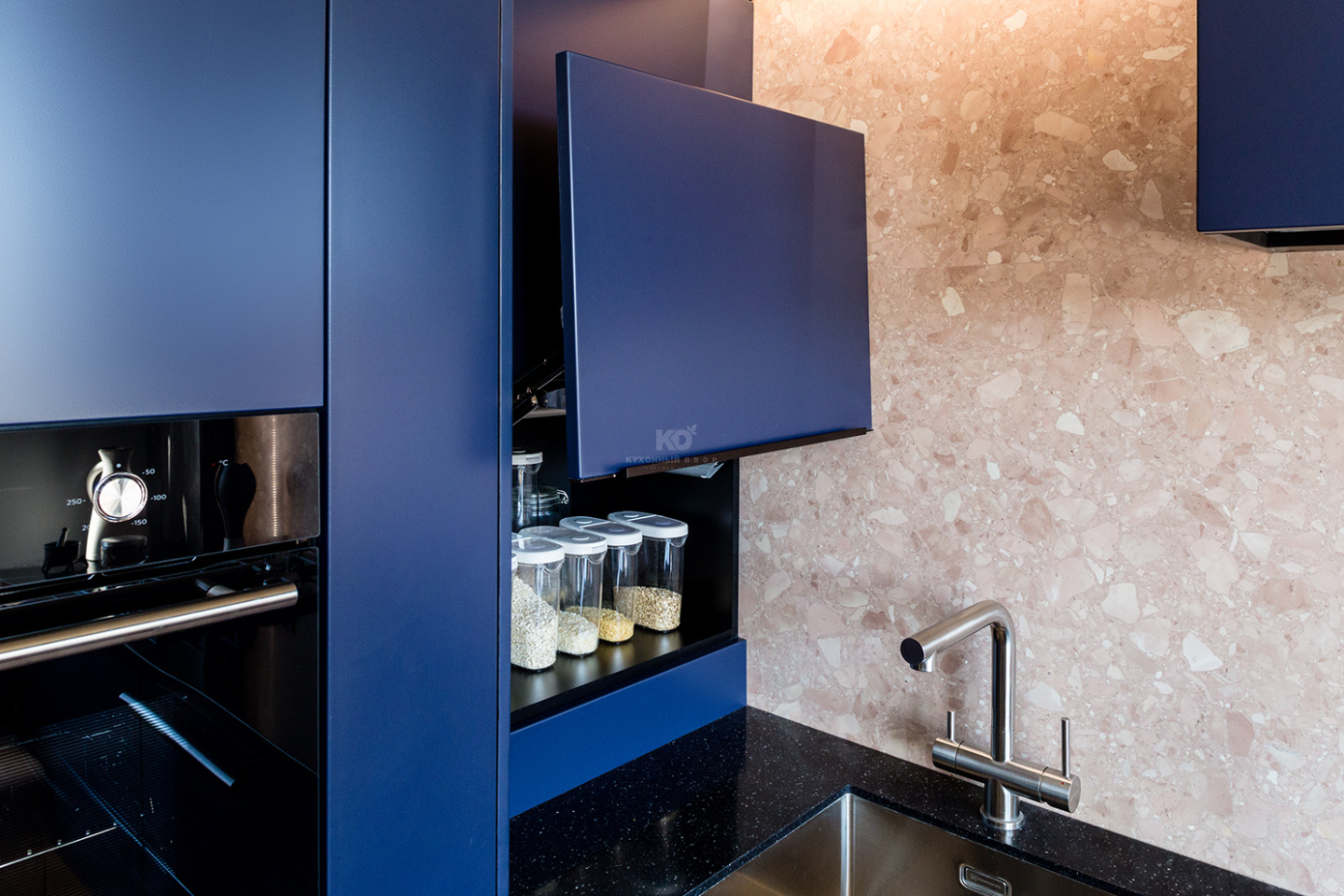 - Насыщенный синий оттенок и матовые поверхности. За счет этого мебель выглядит благородно и дорого.