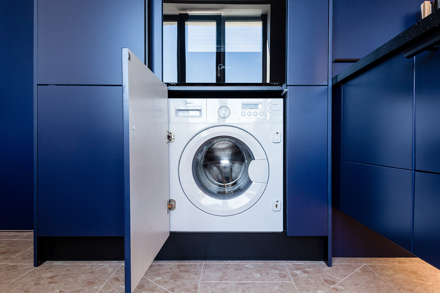 - Практически вся встроенная техника поместится в нишах, то есть микроволновка, стиральная машина – все это будет закрыта глухим полотном, благодаря чему гарнитур смотрится единообразно.