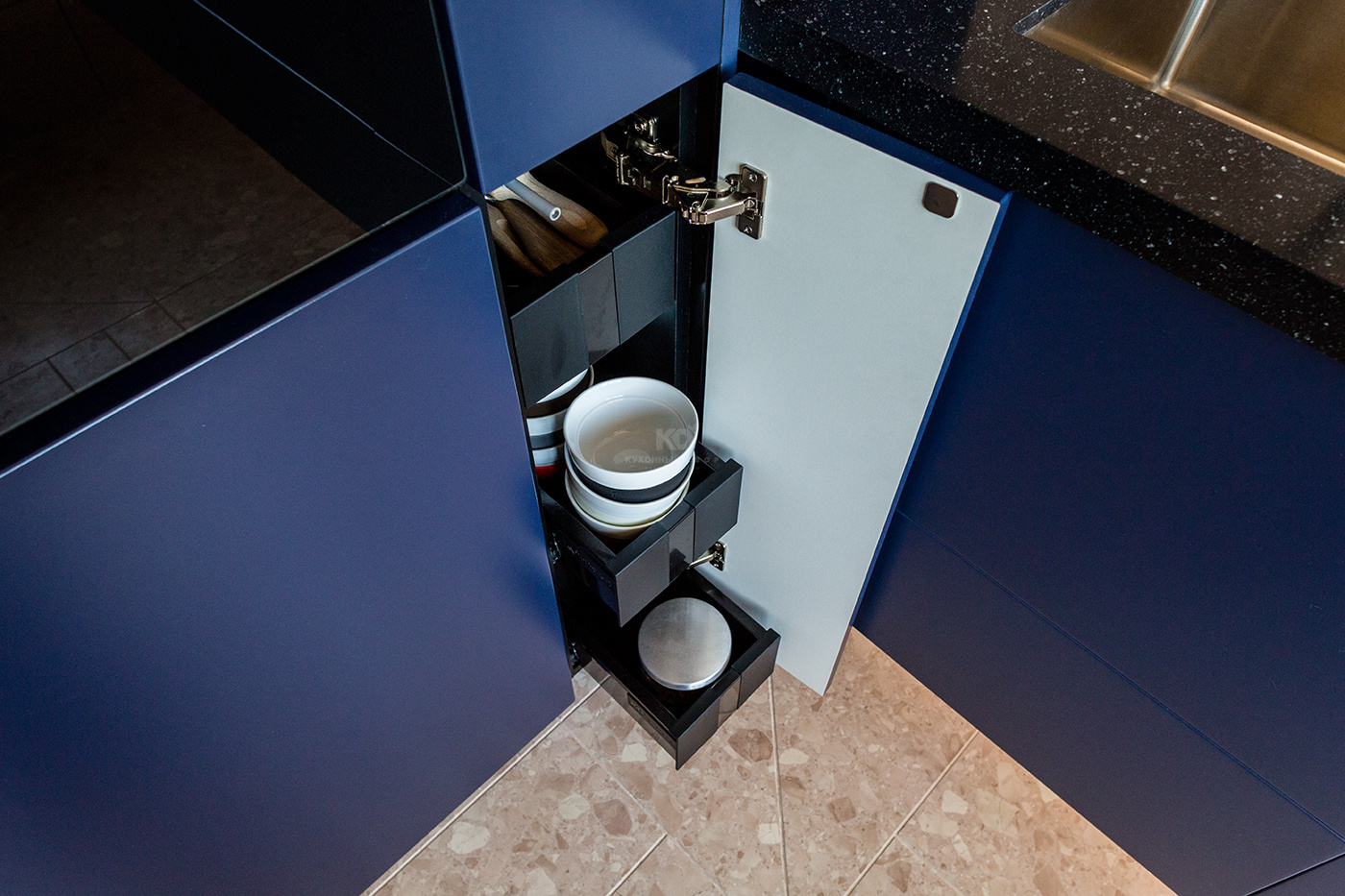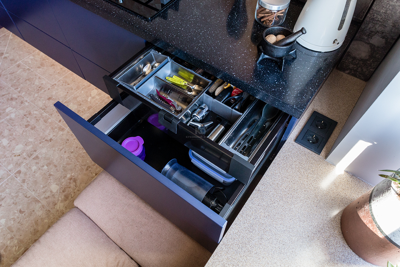 - Множество ящиков и секций для посуды, аксессуаров и других вещей, которые также скрыты фасадами.